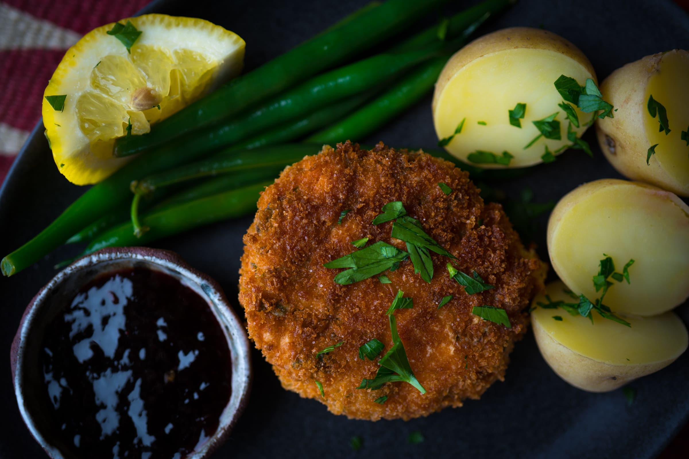Once firm, gently dredge patties in flour, then egg, then breadcrumbs.