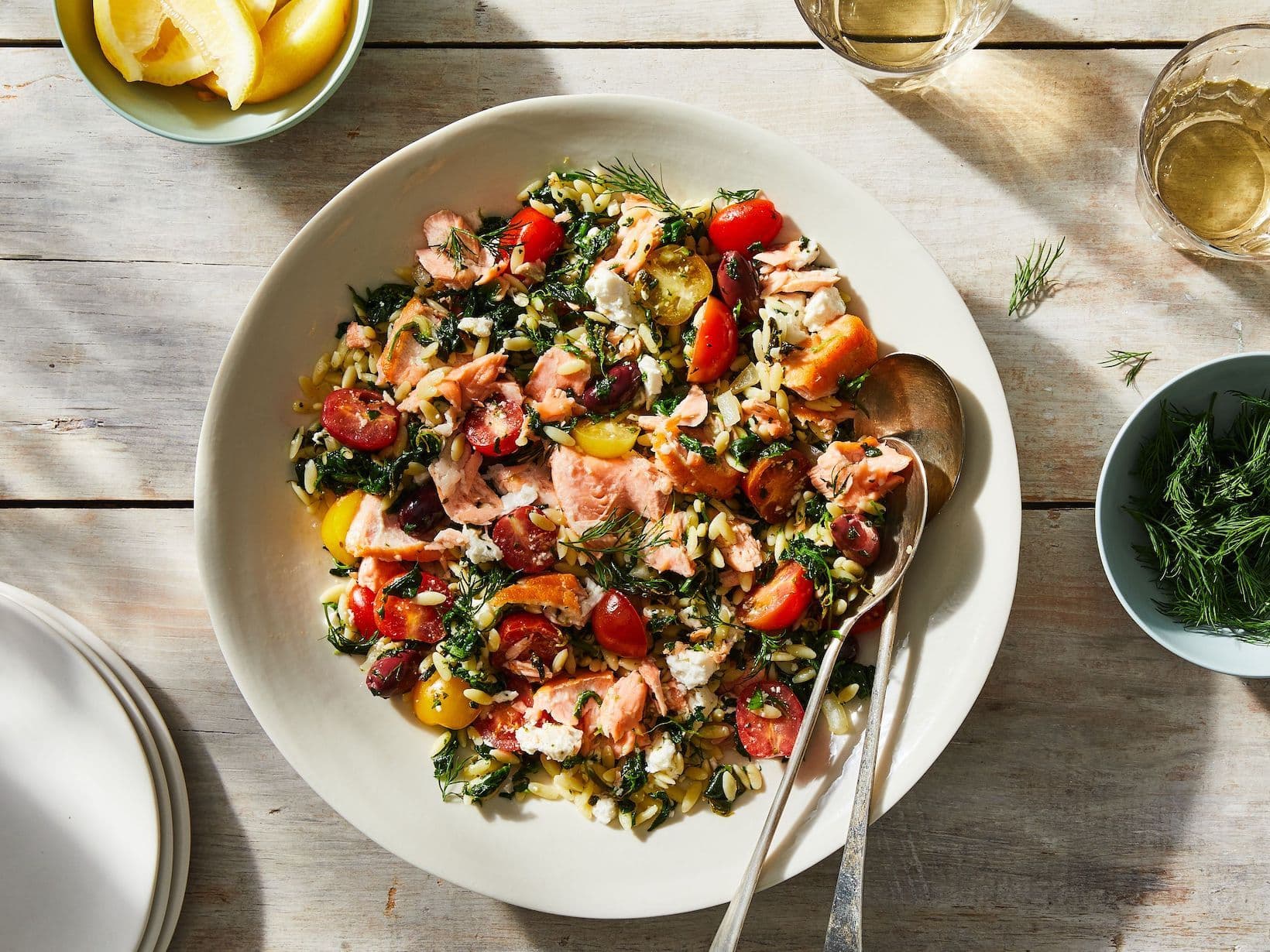This Greek-inspired recipe is the perfect mash-up of spanakopita (spinach pie) and pasta salad. Sautéed ground salmon burger is tossed with orzo, spinach, feta, olives, tomatoes, and dill for a delicious and nutritious all-in-one meal. It works equally well with flaked leftover salmon, chopped salmon fillet, or even halibut burger.