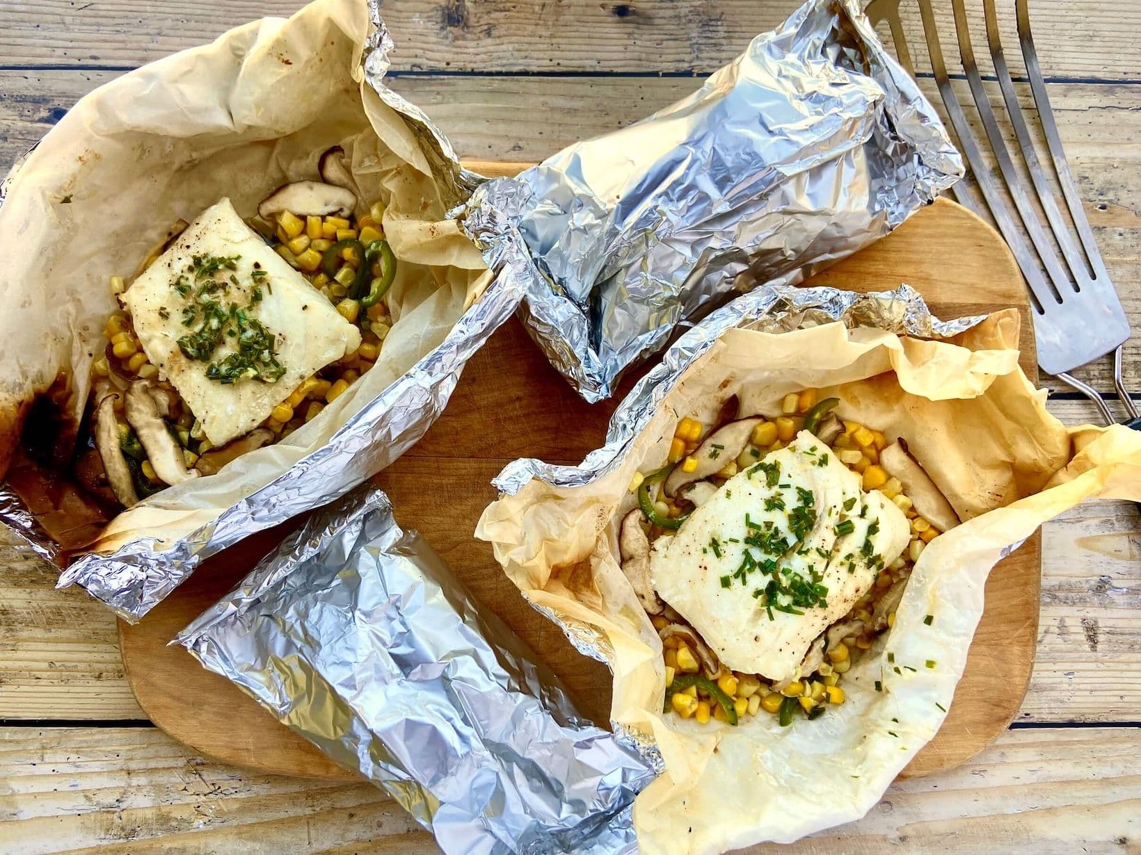 Grilling in foil packets serves several purposes — there’s no risk of the delicate fish sticking to the grill; the compound butter mixes with the fish and vegetable juices to make a delicious sauce; and everything is finished cooking at the same time. Using parchment as a liner in the packets keeps the fish from sticking to the foil or reacting to acidic ingredients, but is totally optional. The packets can be baked if grilling isn't in the cards.