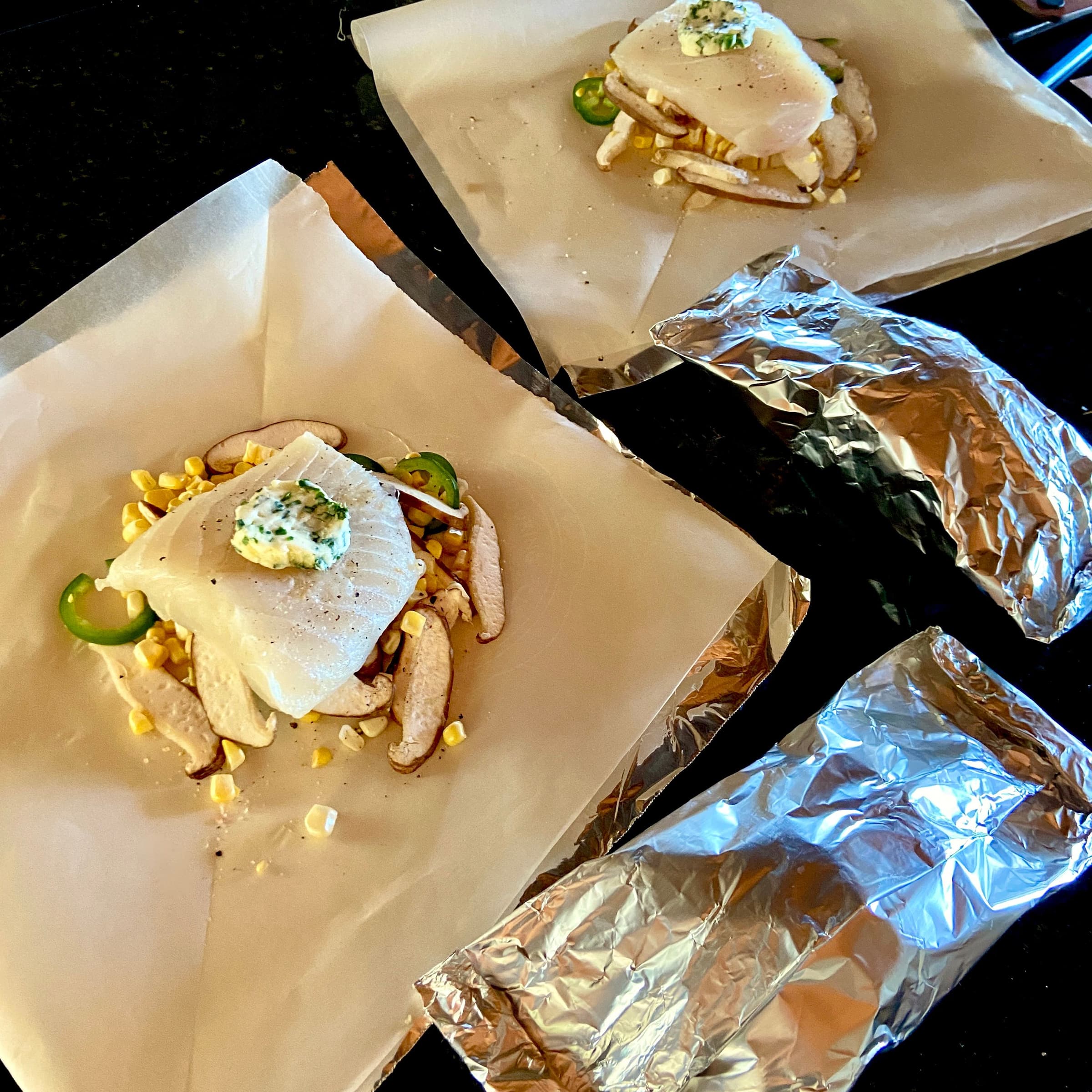 Arrange four 12-inch sheets of heavy-duty foil on a work surface. Top with four 12-inch sheets of parchment paper. In a bowl, toss the corn, shiitakes, and jalapeño and season with salt and pepper. Divide the mixture evenly between the sheets and form it into a mound in the center. Top each with a piece of the herb butter. Top with halibut and another piece of butter and season with salt and pepper. Fold up the packet on all sides and seal the seams.
