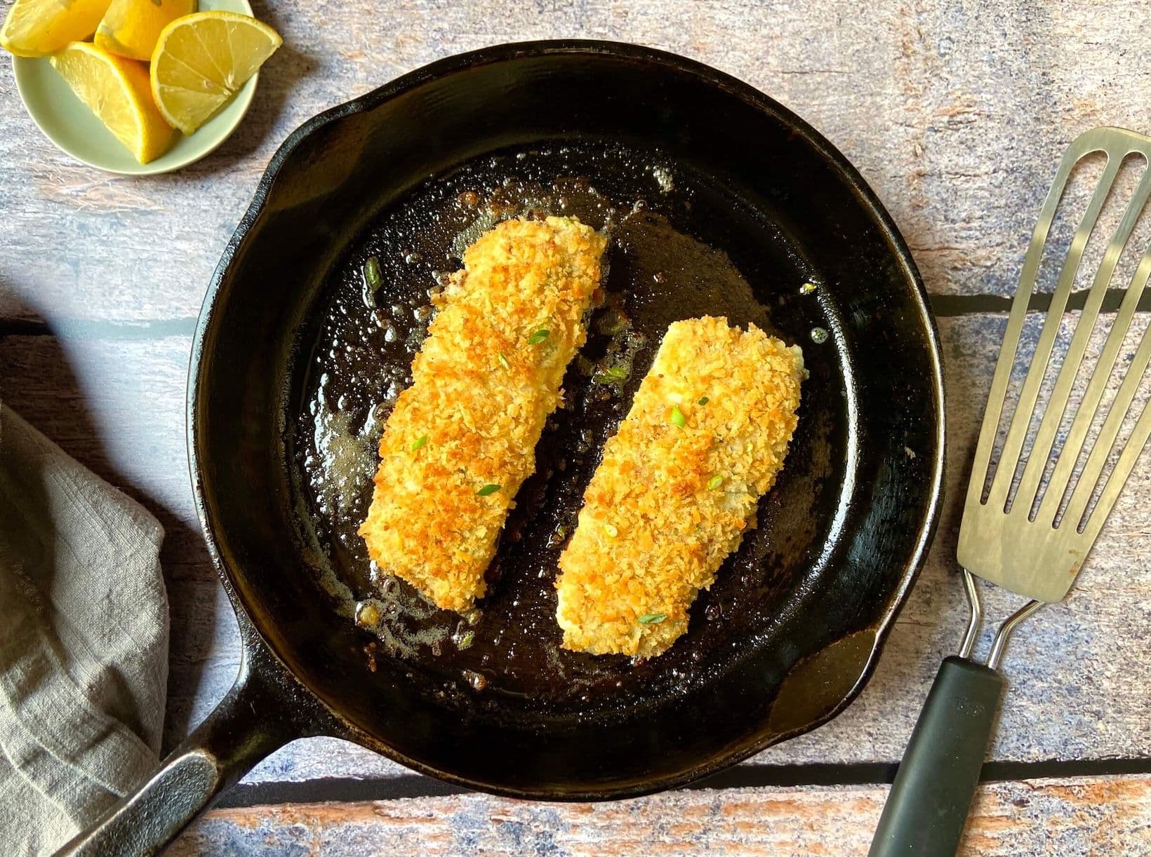 Meanwhile, in a medium cast-iron skillet over medium heat, melt 2 tablespoons of the butter. Add the panko and cook, stirring constantly, until lightly browned, 3 to 4 minutes. Season with a pinch of salt and transfer to a plate to cool. Wipe out the skillet and set aside.