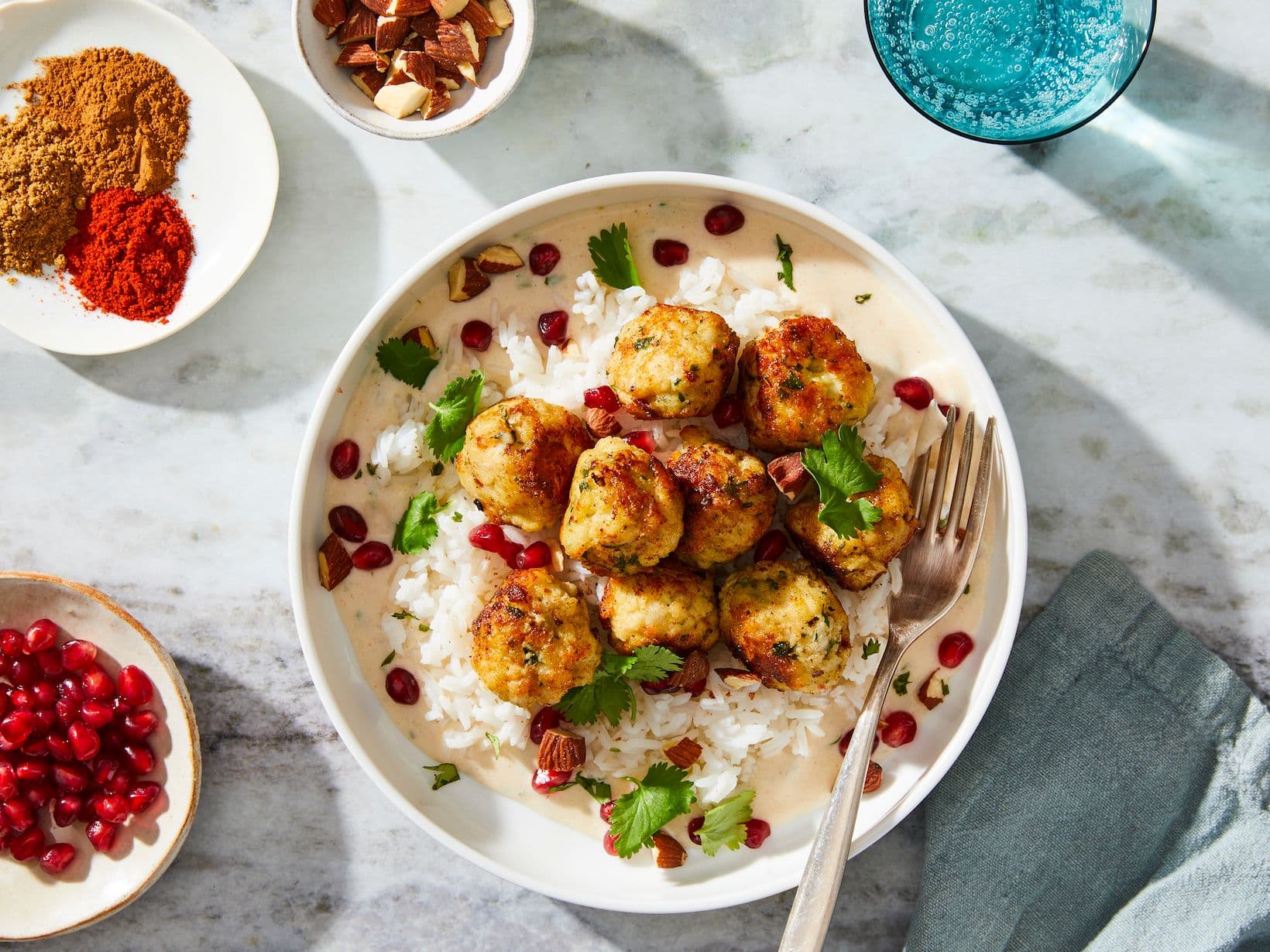 You’ll swear you’re dining in Greece, Turkey, or Lebanon with this Mediterranean-inspired dish of fragrant seafood meatballs served with a luscious yogurt sauce and garnished with tart-sweet pomegranate seeds