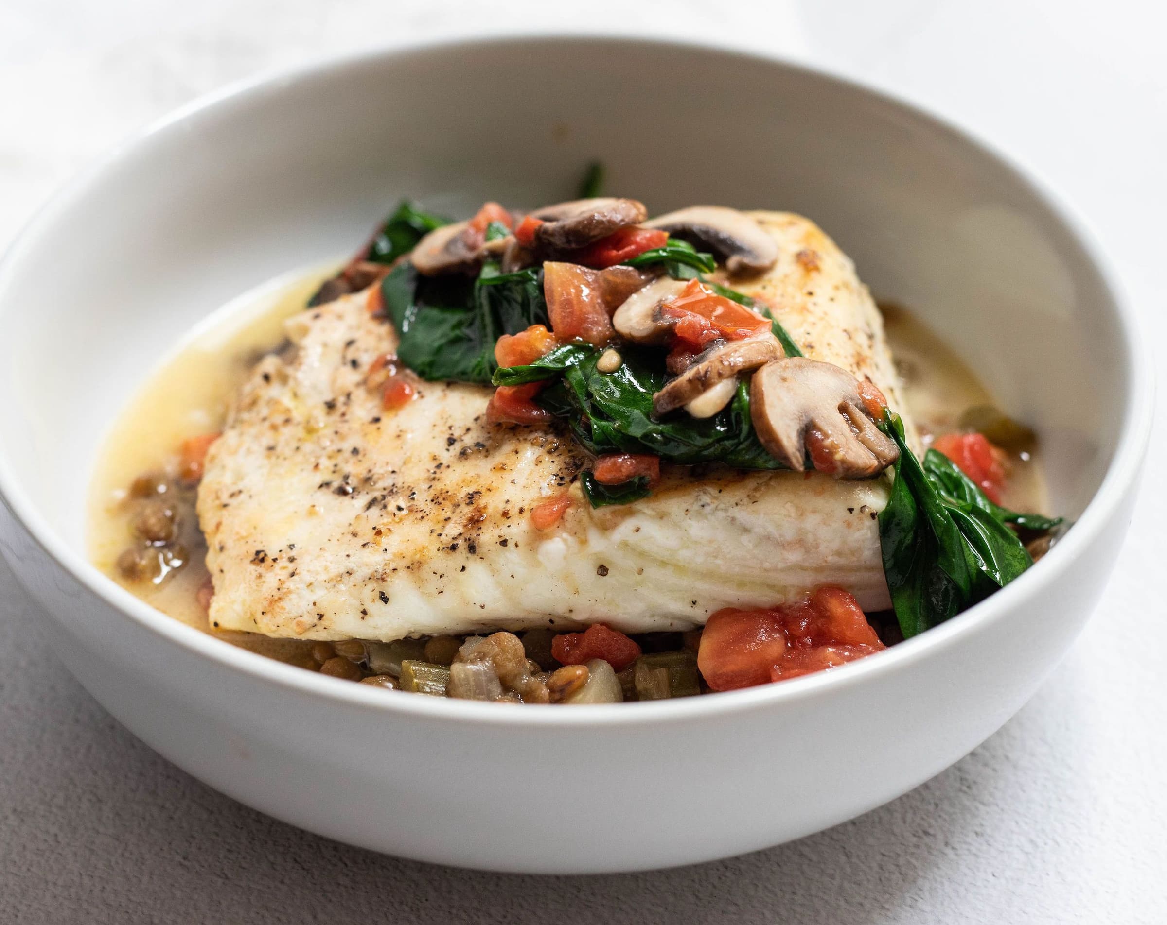 Spoon braised lentils into shallow bowls and top with seared halibut. Spoon sautéed vegetables on top and drizzle with lemon butter sauce. Enjoy!