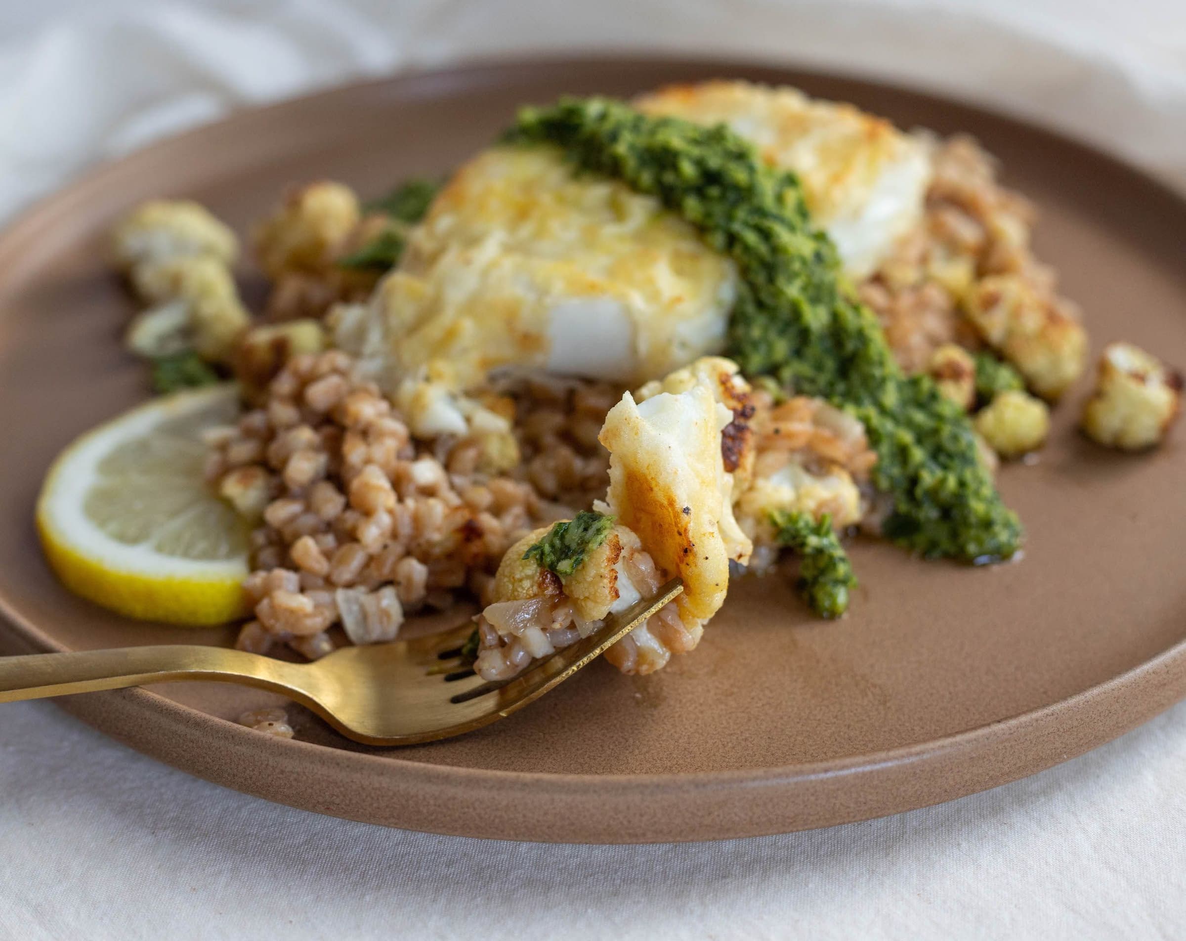 Finish farro with roasted cauliflower. Place halibut fillets over cauliflower, top with pesto, and garnish with lemon wedges.