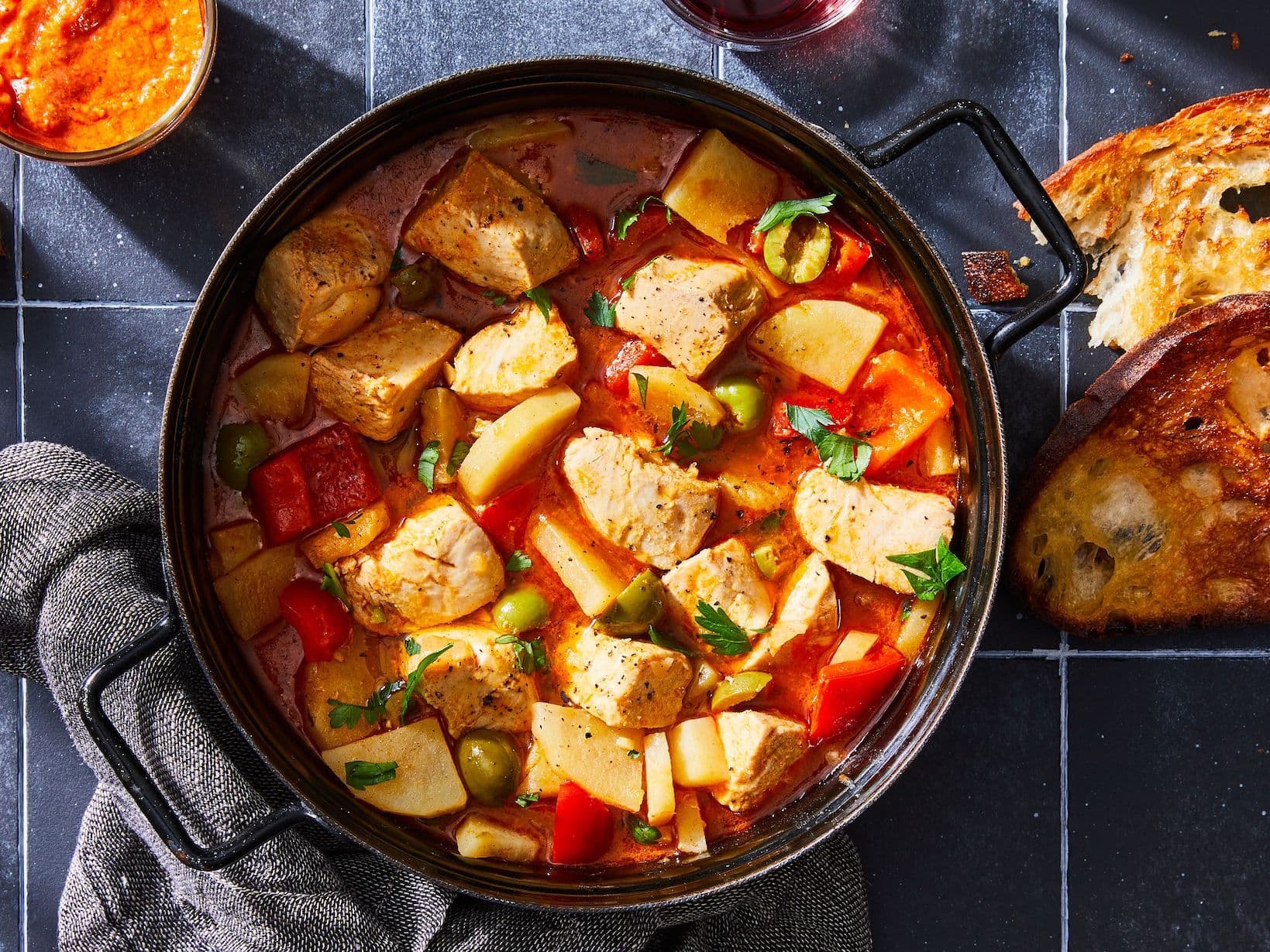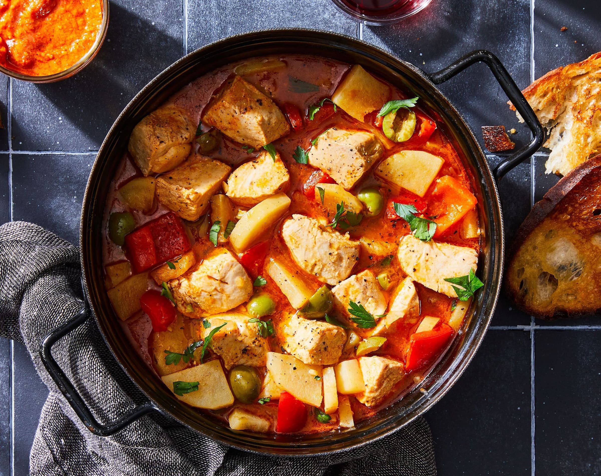 Chopped parsley, crusty bread, and Romesco sauce for serving