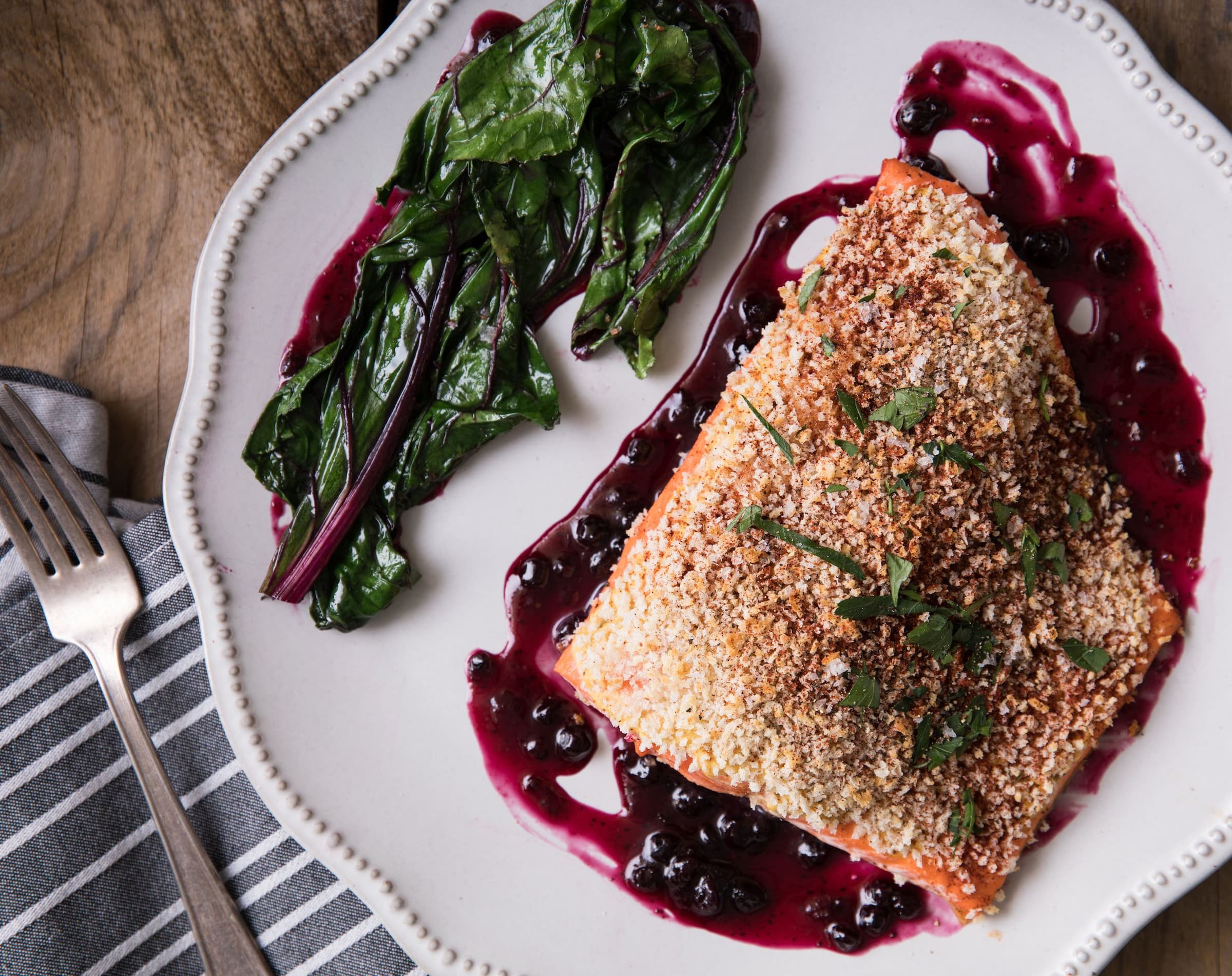 Season the salmon with salt and pepper. Spread 1 tablespoon Dijon mustard on the flesh side of the salmon, then press the panko breadcrumbs into the dijon mustard (the mustard will act as an adhesive). Dust the panko with ¼ teaspoon chipotle powder.