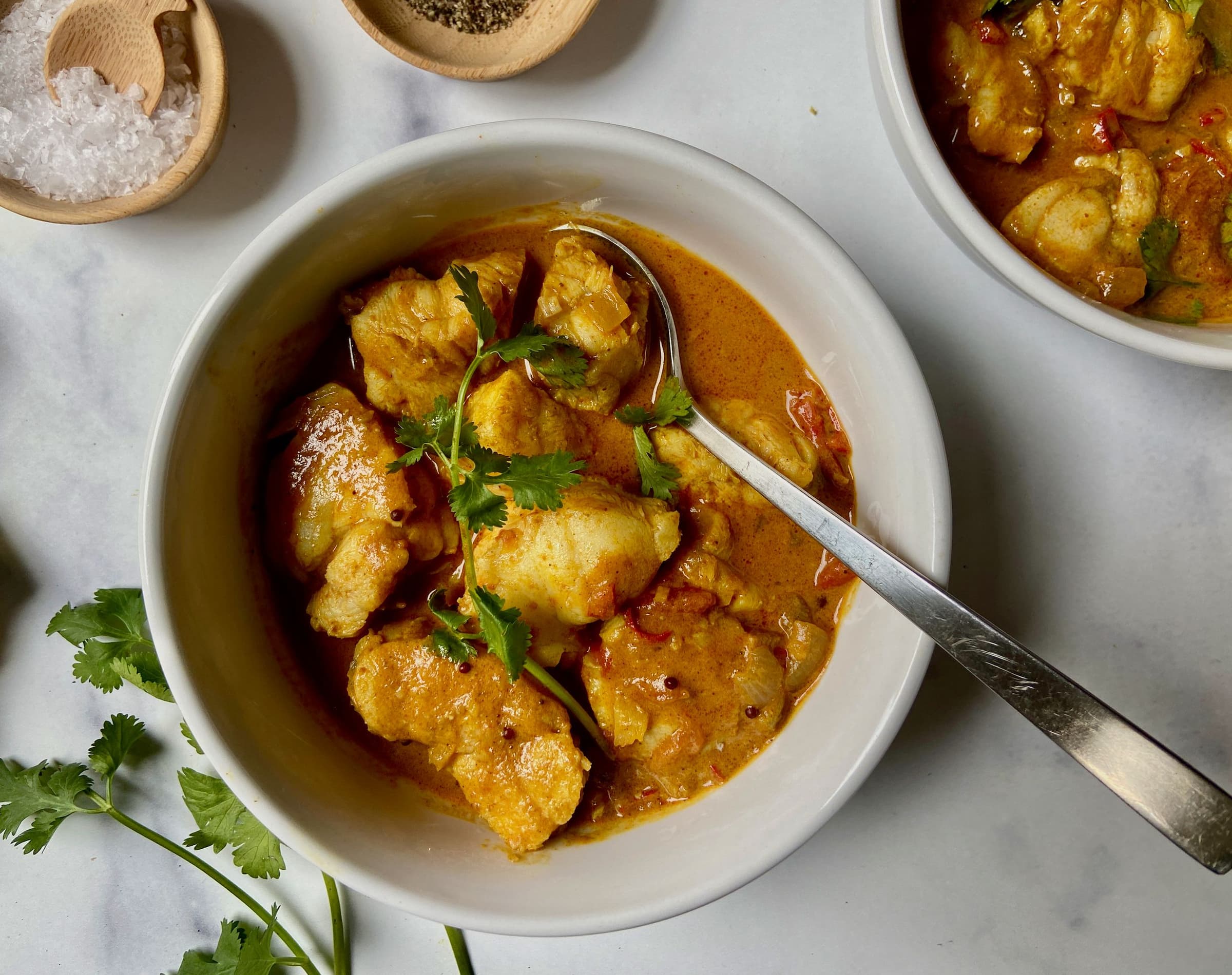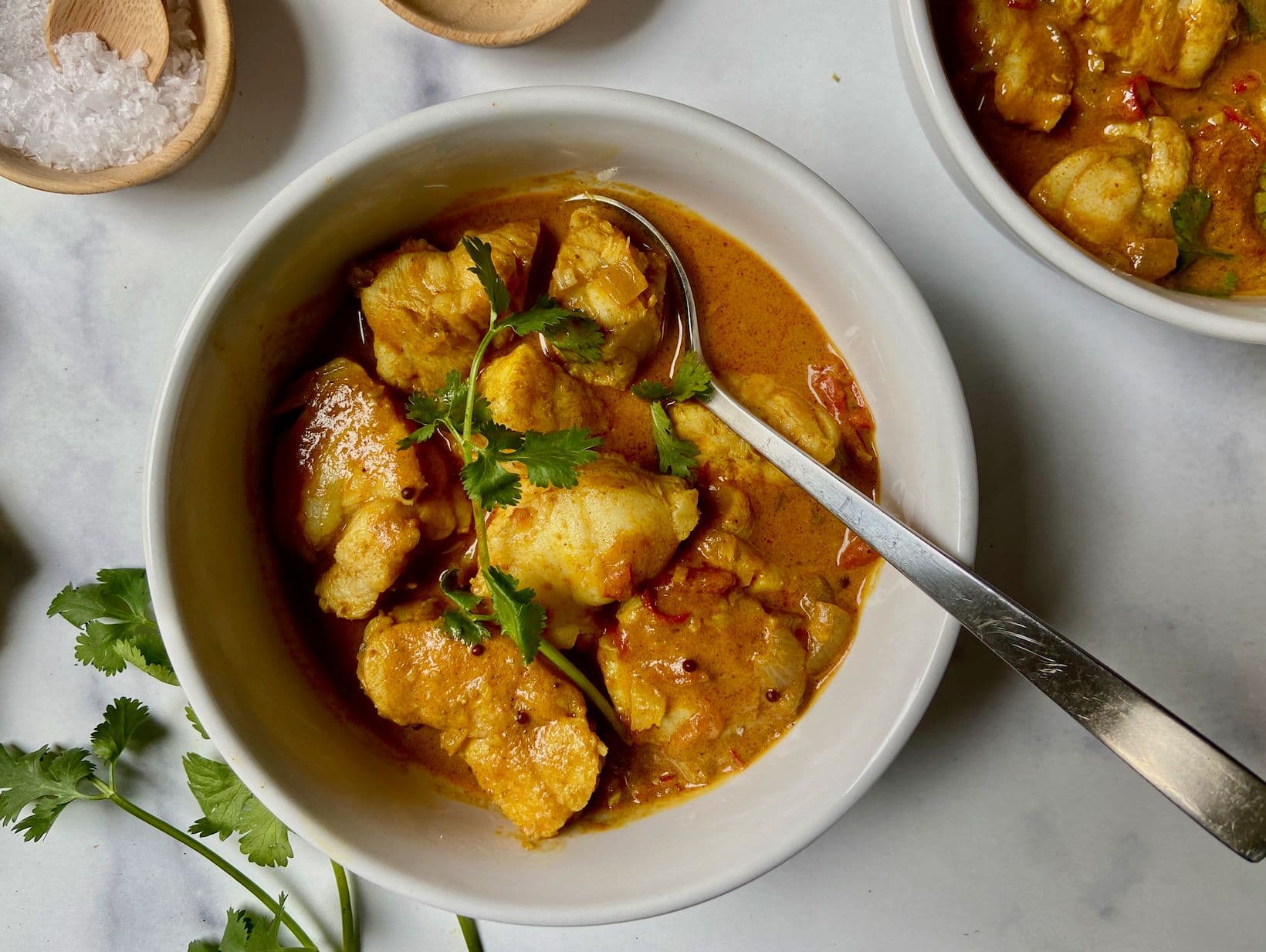 Goa, a state in India, is situated on the west coast along the Arabian Sea. Coconut, fresh seafood, and fragrant spices are staples in Goan cuisine and fish curry is one of the state’s most notable dishes. The addition of a sour element such as tamarind concentrate or dried amchur (sour mango powder) is one of the defining features of Goan cuisine and worth seeking out. However, apple cider vinegar is a good alternative. While this recipe calls for meaty monkfish medallions, any white fish would do nicely.