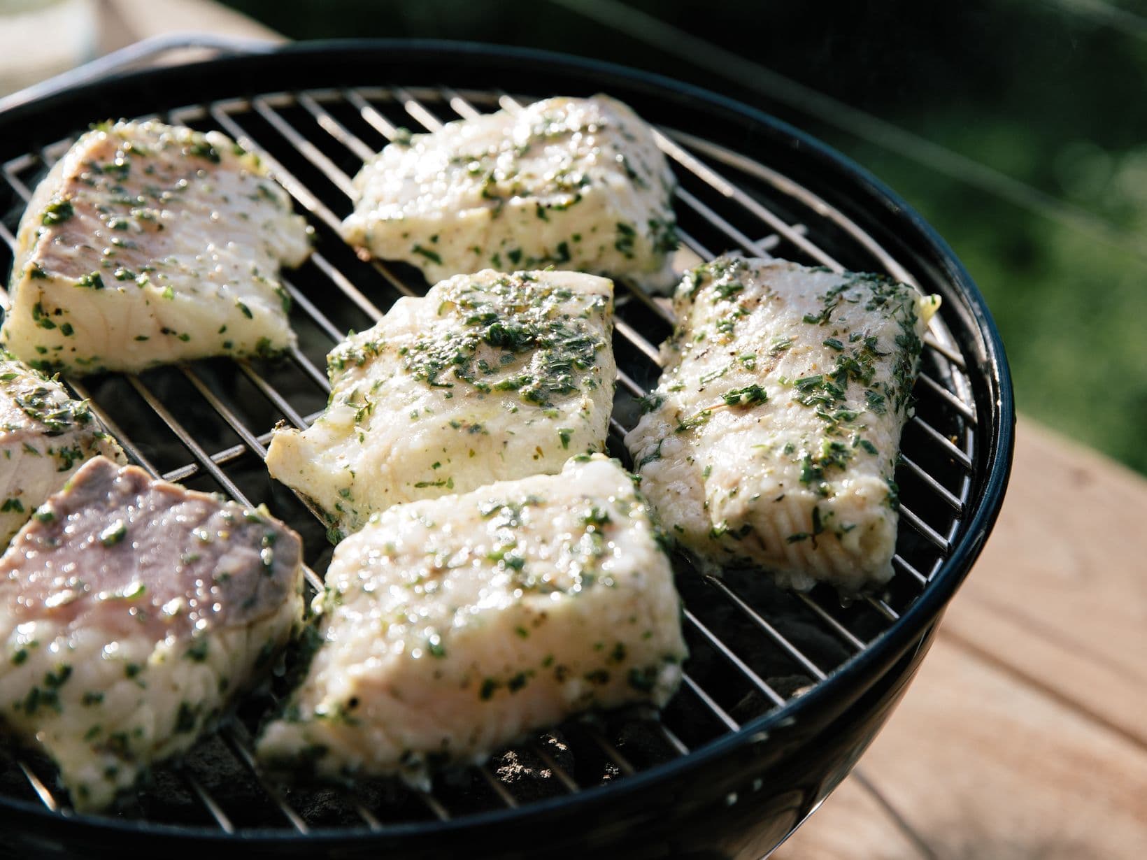 Heat gas or charcoal grill to medium-high heat. Oil grill grates well to prevent sticking. Grill for 3 min. a side for thinner pieces or 7-8 min. a side for thicker pieces.