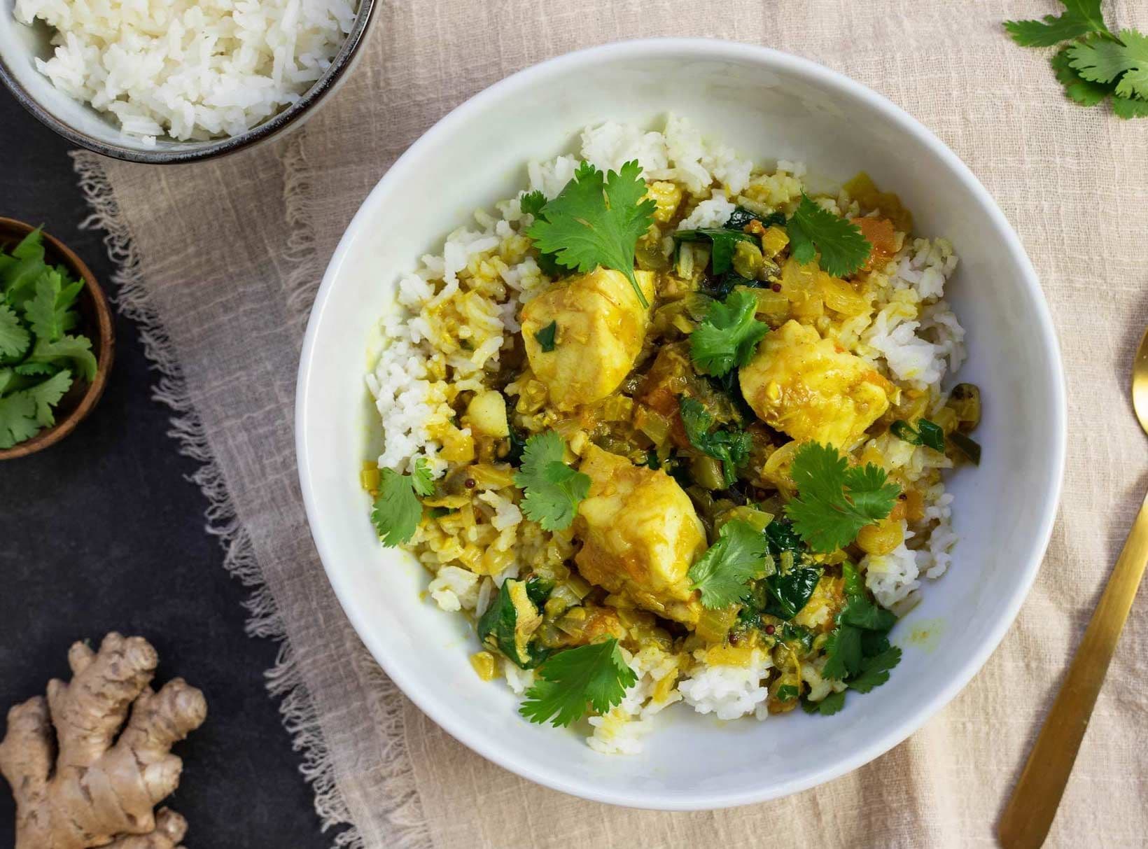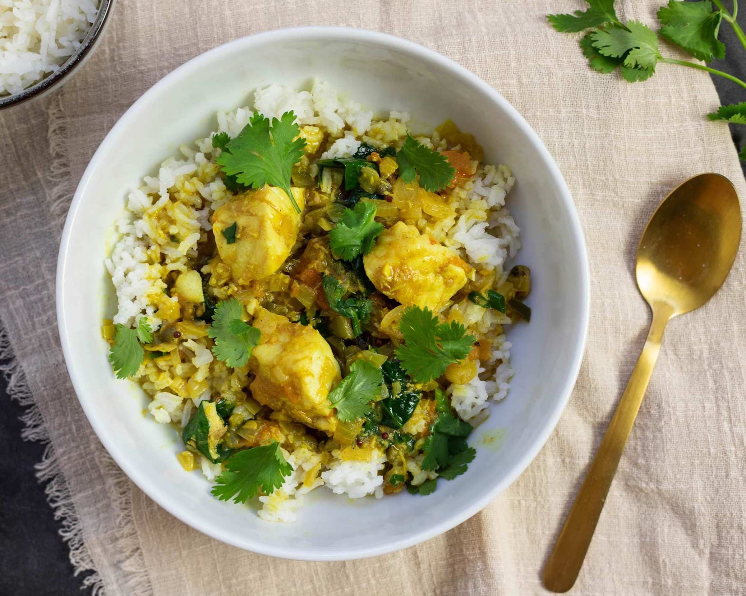 This (mostly) classic fish curry comes from Kerala, in southern coastal India, where seafood and coconut are in great abundance. Curry leaves, no relation to curry powder, impart a pleasant bitterness and can be found fresh in Indian markets or dried online. There are no real substitutes, but unavailability will not change how delicious this dish is. While not traditional, we’ve added spinach for extra nutrition. It’s delicious, super easy to prepare, and great with most any white fish or even spot shrimp