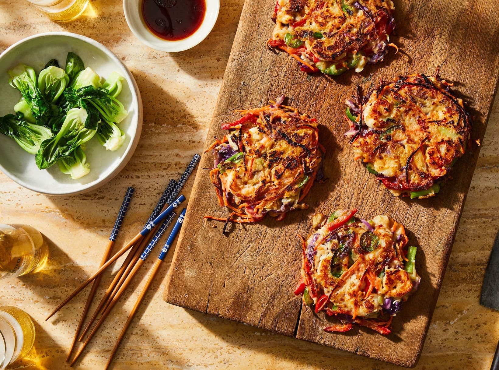 Known as haemul pajeon in Korea, there are as many variations of these delicious pancakes as there are vegetables and seafood. Ours just happen to include succulent spot shrimp, sweet bell pepper, and coleslaw mix for extra crunch and easy prep. Use whatever you have on hand—aim for about 1½ cups of chopped or shredded vegetables and 1 cup picked crabmeat to make four pancakes.