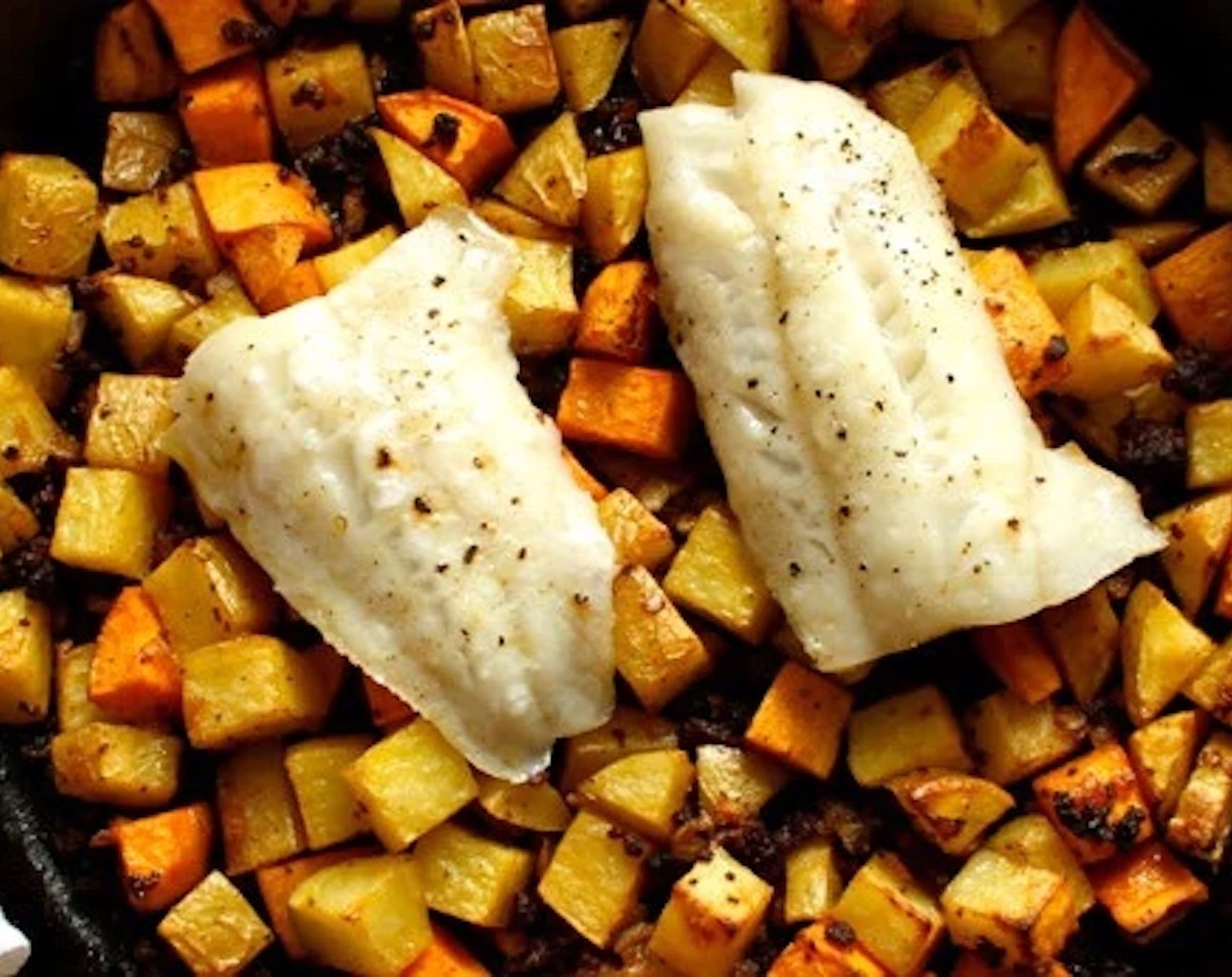 Season lingcod fillets with salt and pepper and place on top of the hash and return to oven for 8-10 minutes until fish just begins to flake. Serve immediately.