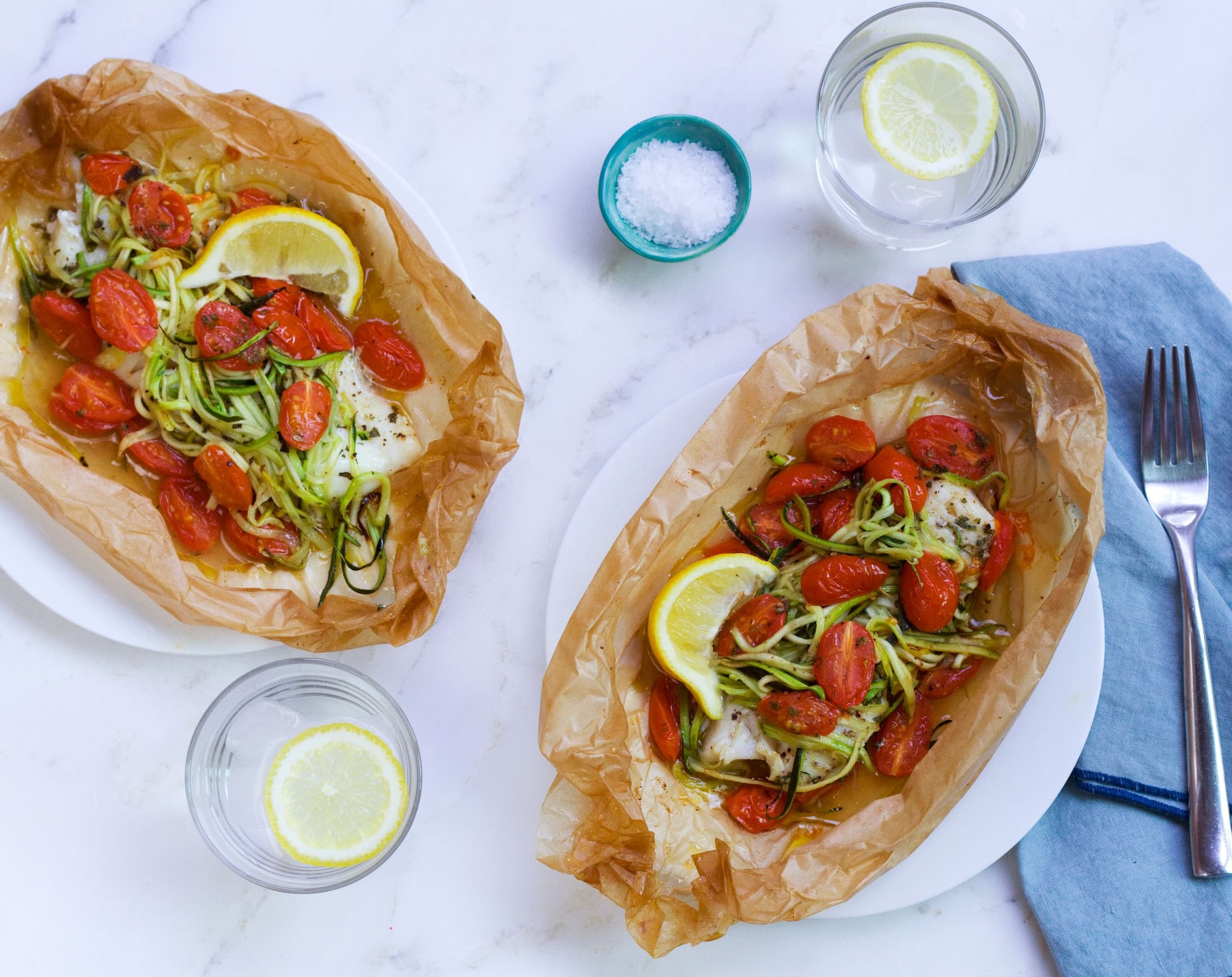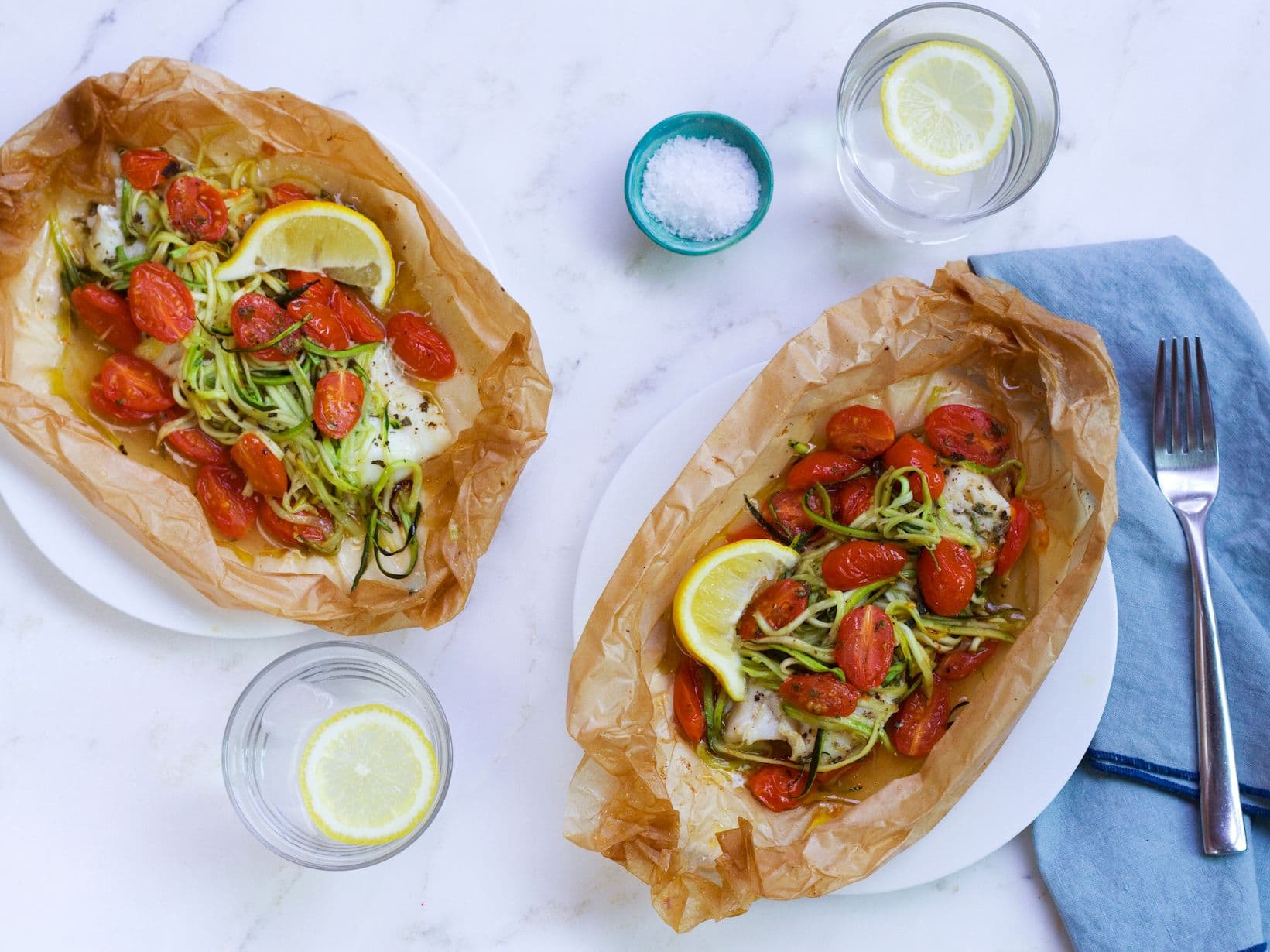 Steam-baking tender cod fillets in parchment paper is a healthy and delicious way to infuse flavor into the fish — and a handy way to make a complete meal. Fresh herbs such as oregano add a burst of fragrance when the package is opened. If you don’t have a spiralizer, just slice the zucchini thinly and lay the slices underneath the fish. Add mashed potatoes or steamed red potatoes on the side if you are looking for a heartier meal.