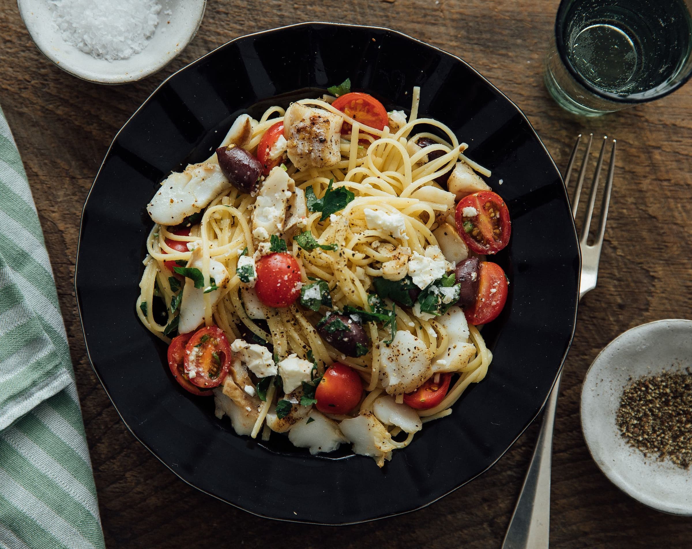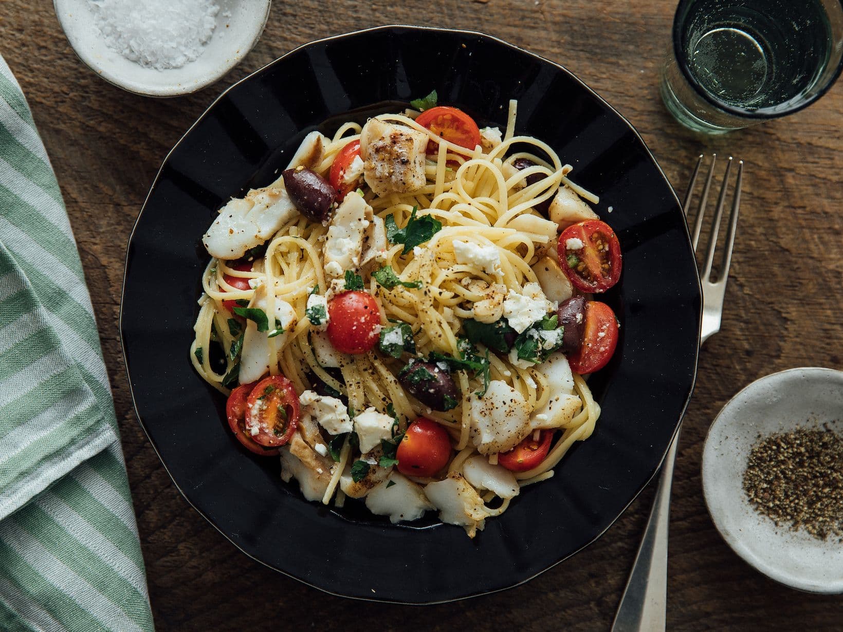 This white fish pasta is loaded with Mediterranean flavors such as garlic, tomatoes, olives, and feta. While it looks impressive, the whole thing comes together in under 30 minutes. If you don’t have linguine, try another long, thin pasta like bucatini or spaghetti.