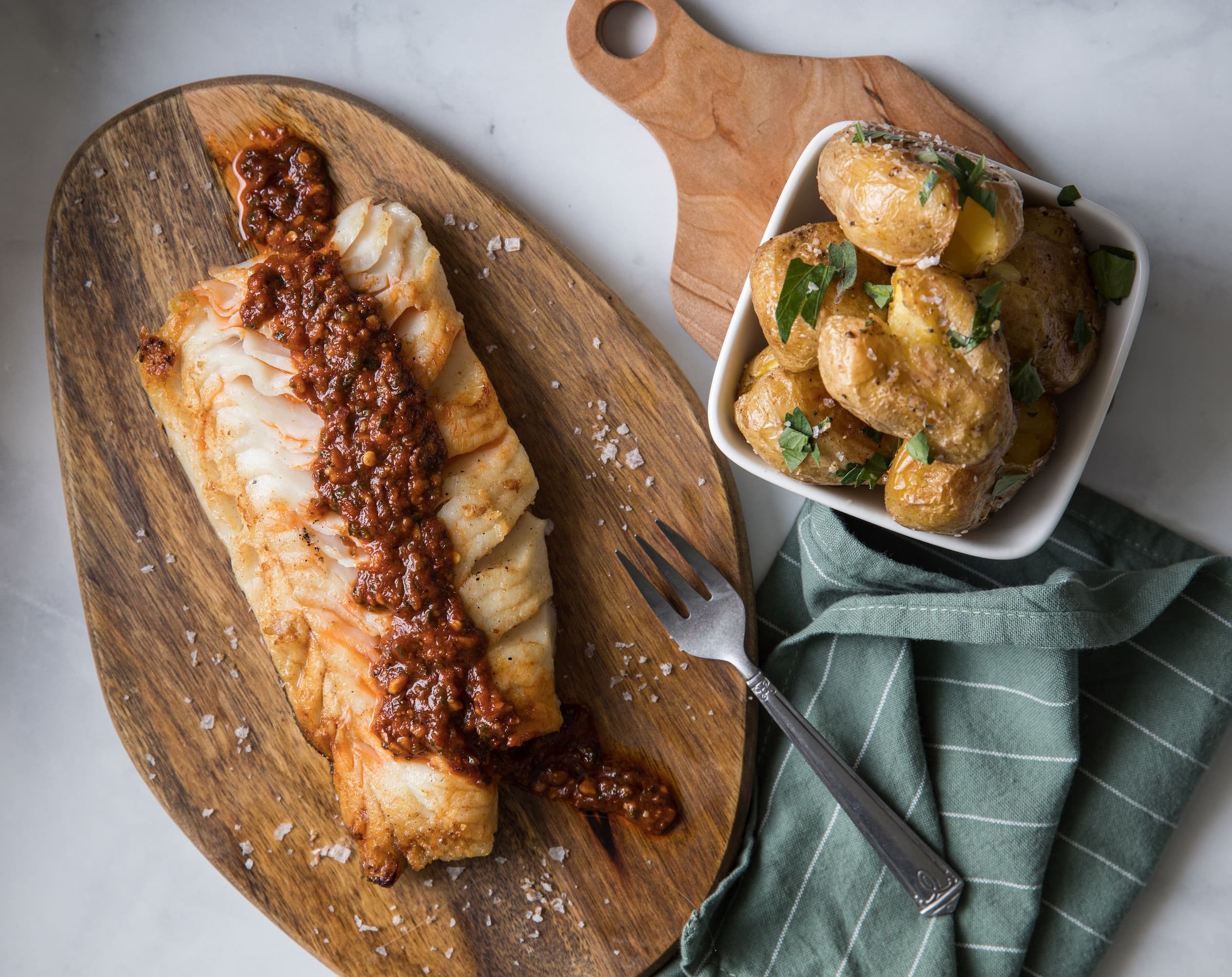 Serve the sablefish by topping it with a generous serving of Mike’s chermoula sauce.