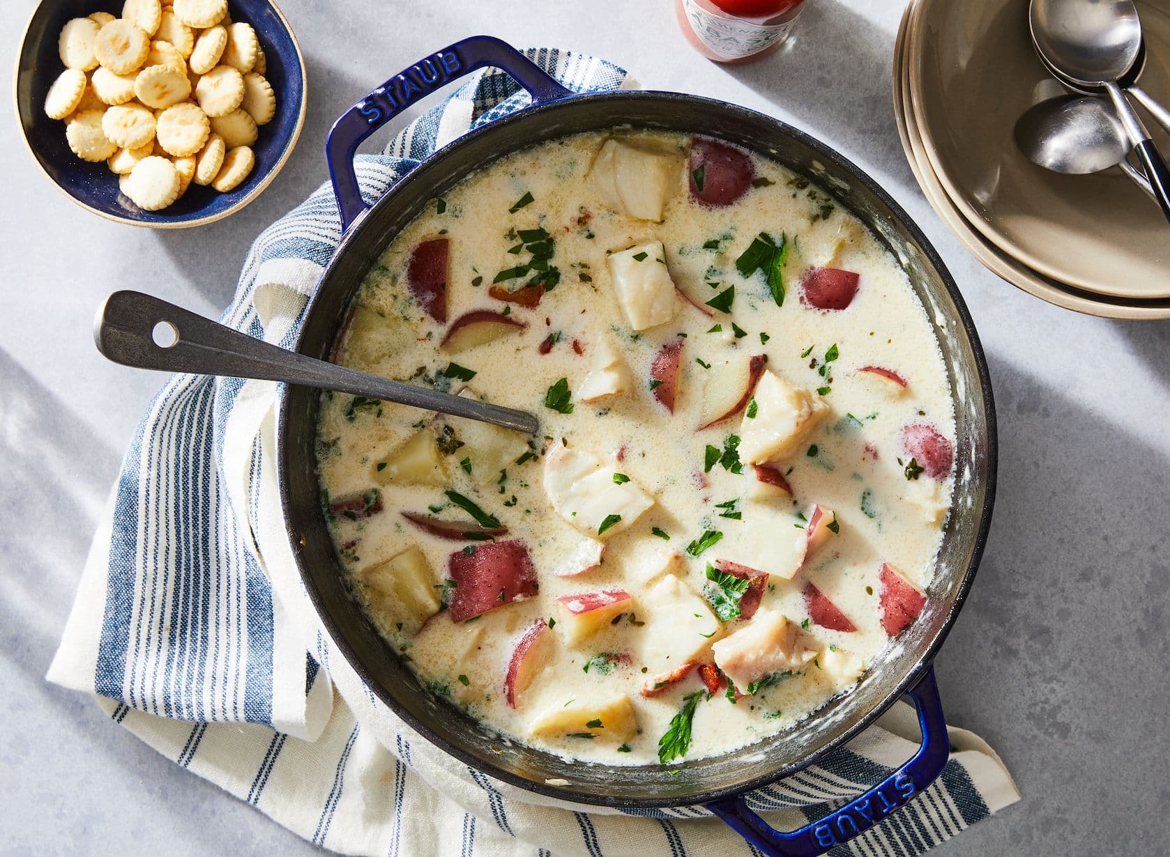 Creamy New England–style fish chowder pairs really nicely with full-bodied white wines such as chardonnay or viognier, or a crisp New England beer like Narragansett lager.