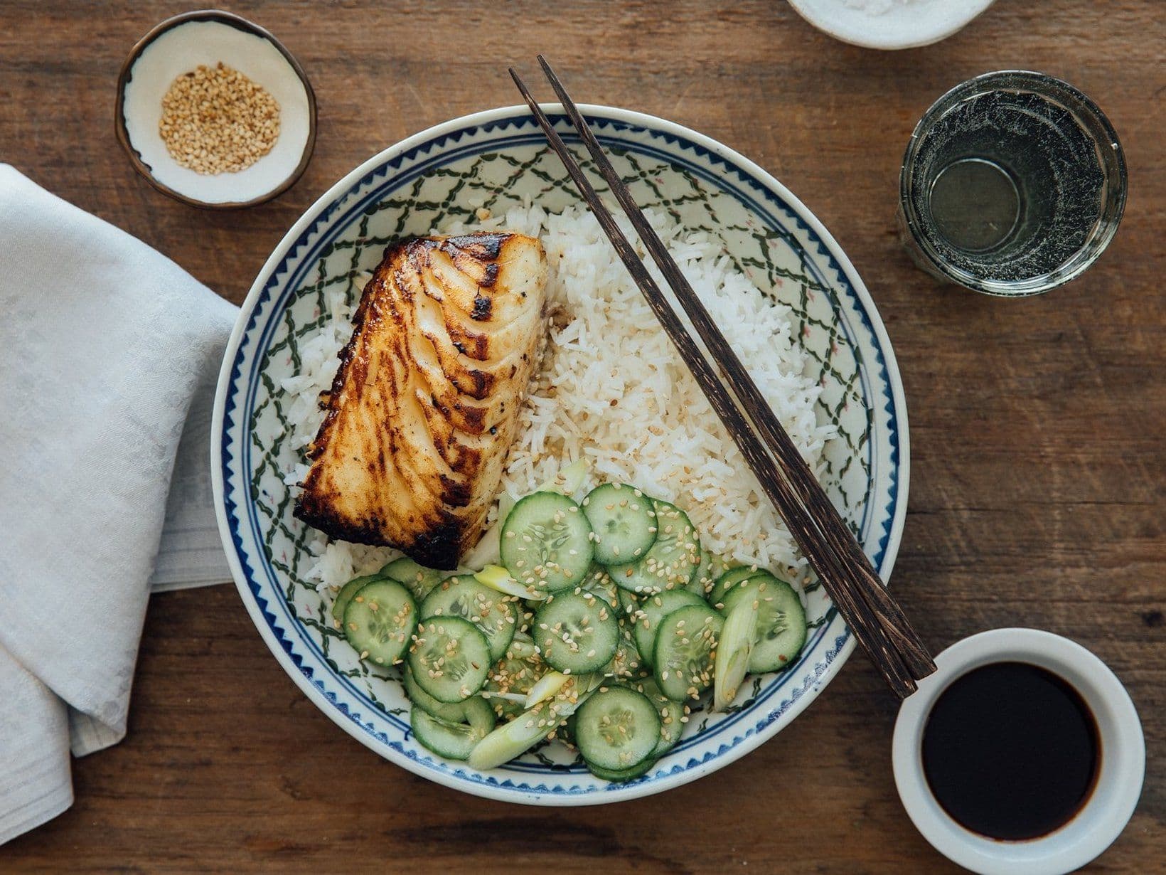 Divide steamed rice between two bowls. Top with sablefish and cucumber salad.