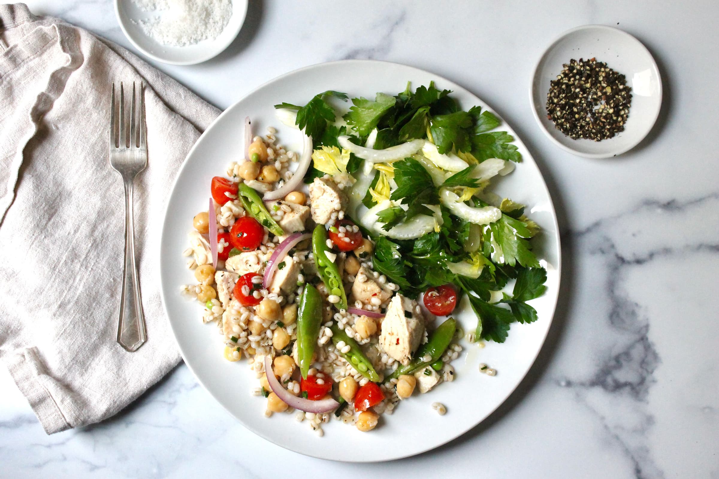 Into a large bowl, squeeze 3 tablespoons lemon juice. Whisk in the reserved olive oil and season with salt and pepper. Add the grains, snap peas, tuna, chickpeas, onion, tomatoes, and chives and toss to combine, leaving the tuna in bite size pieces.