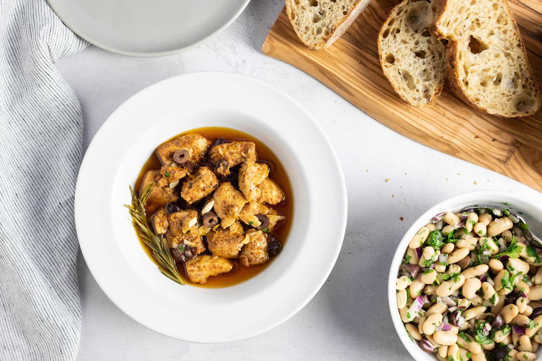 Meanwhile, in a medium bowl, combine the white beans, red onion, parsley, orange juice, and the remaining olives. Add 2 tablespoons of the warm olive oil, stirring to combine. Season with salt and pepper to taste.