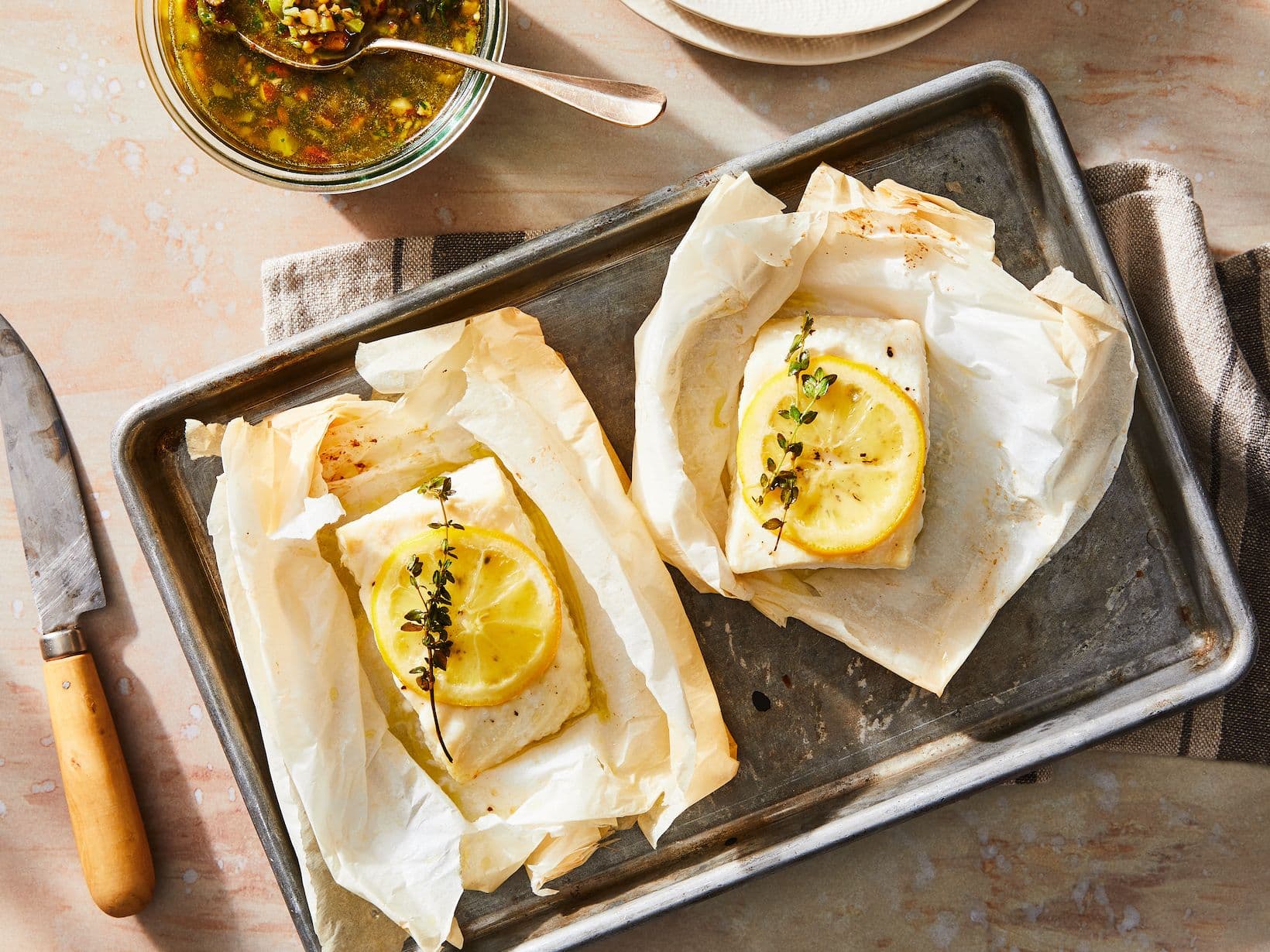 Lift two opposite sides of the parchment paper to meet in the middle above the fish fillet. Tightly roll the paper all the way down to the fish, then fold over each end and tuck it underneath the package to seal. Place the parchment packages on a sturdy baking sheet in a single layer.