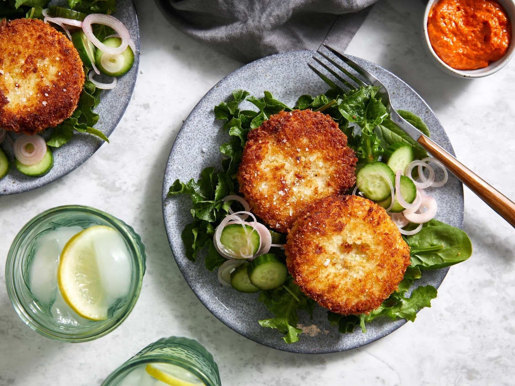 Fish cakes and Romesco sauce is a winning combination. We’ve simplified this Catalan sauce, which typically includes roasted tomatoes, by swapping in sun-dried tomatoes. Tart, quick-pickled cucumbers and shallots add brightness and crunch. Double the recipe for an elegant dinner party for four.