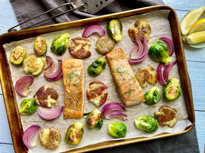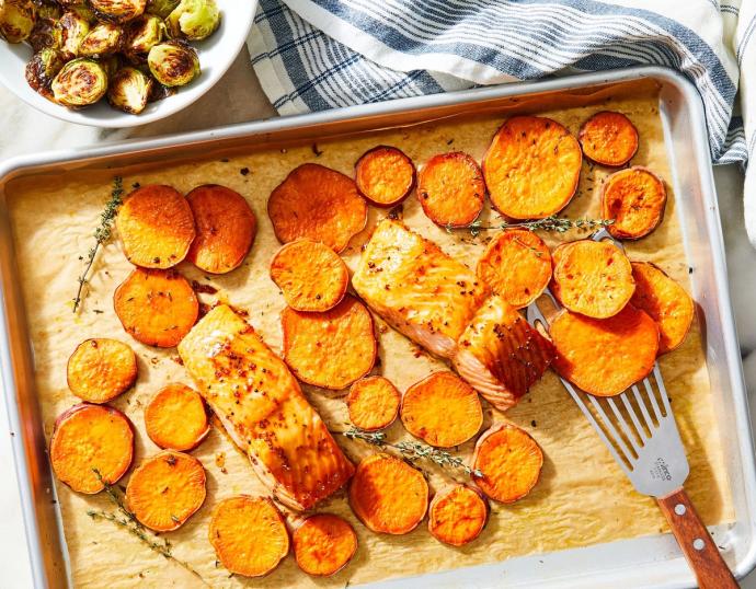This simple all-in-one sheet pan supper requires just a little attention to make sure all of the components are perfectly cooked at the same time. Frozen steak fries make prep and cooking even easier, so all you need to do is bake and enjoy. In fact, you can even bake fish straight from the freezer in case you forgot to thaw it the night before, though you’ll need to add a few more minutes in the oven. Just be sure to rinse off the saline ice and pat the fish really dry so the potatoes stay crisp.