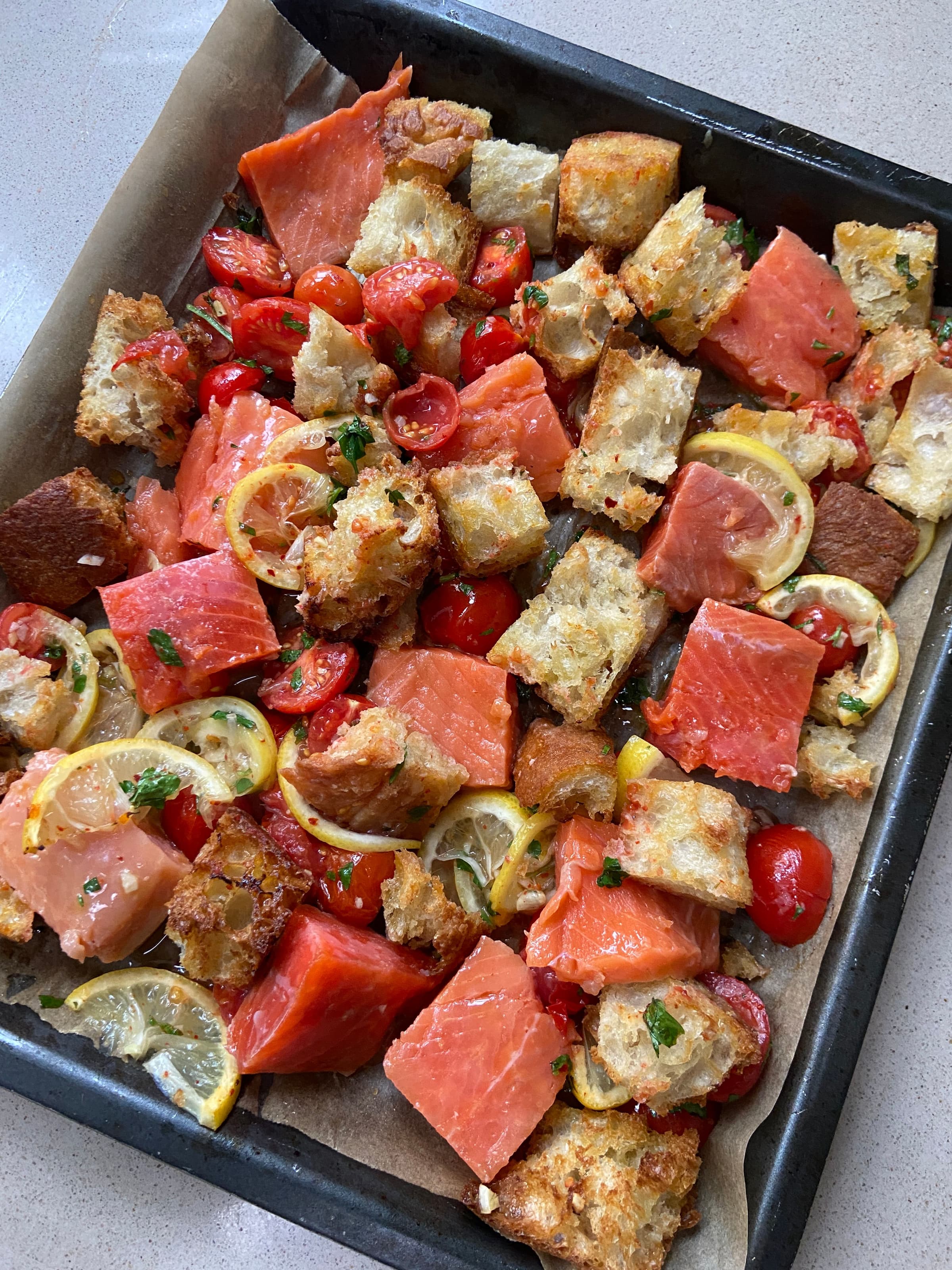 Chunks of rich salmon are nestled in hunks of crusty ciabatta bread tossed with tomatoes and lemon and roasted together on a single sheet pan. The lemon slices add a tangy bitterness that offsets the rich salmon and are absolutely delicious should you choose to eat them.