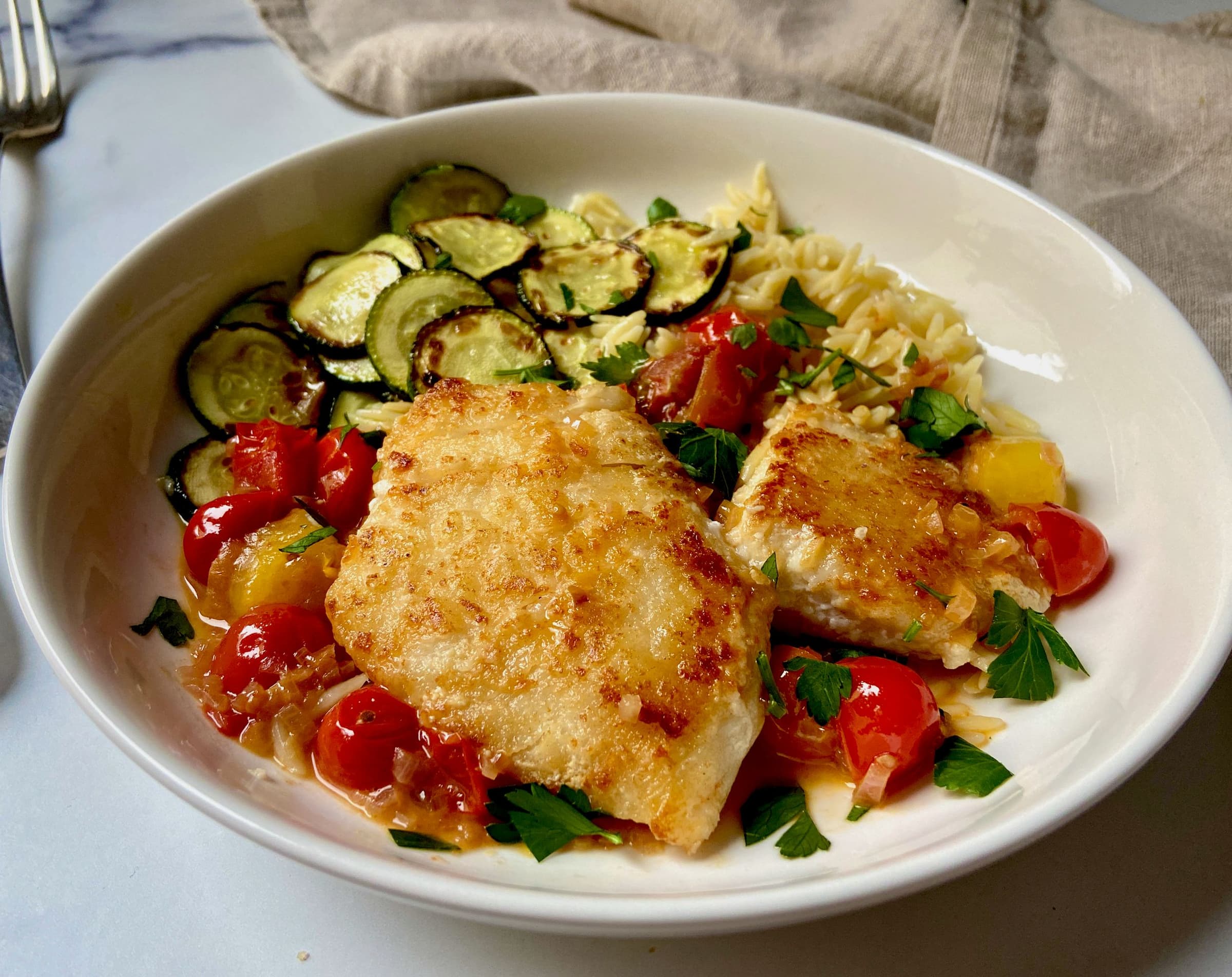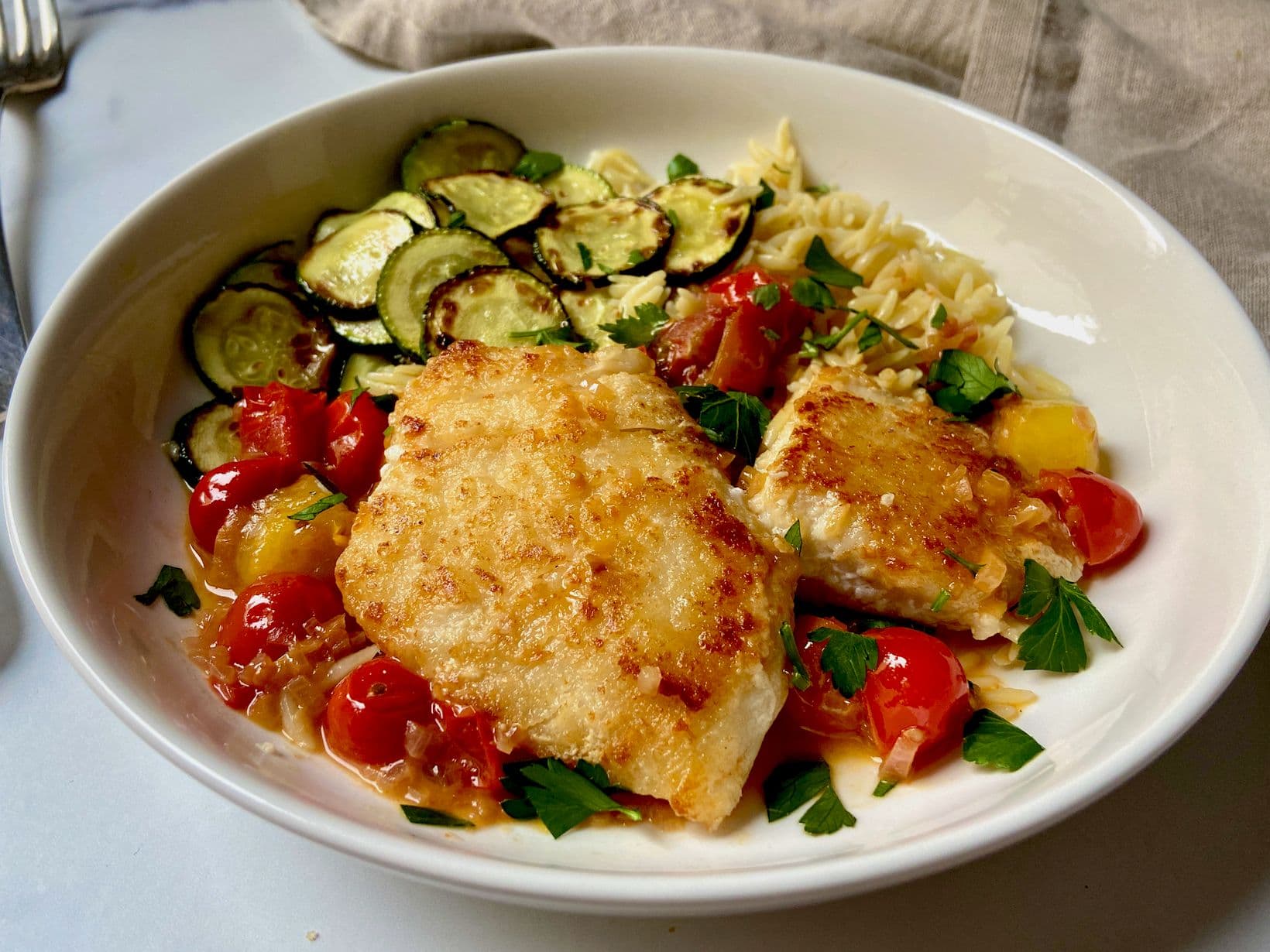 Return the fish to the skillet along with any accumulated juices and turn to coat in the sauce. Divide the halibut cheeks between 4 plates and sprinkle with the herbs. Serve with sautéed zucchini and buttered pasta.
