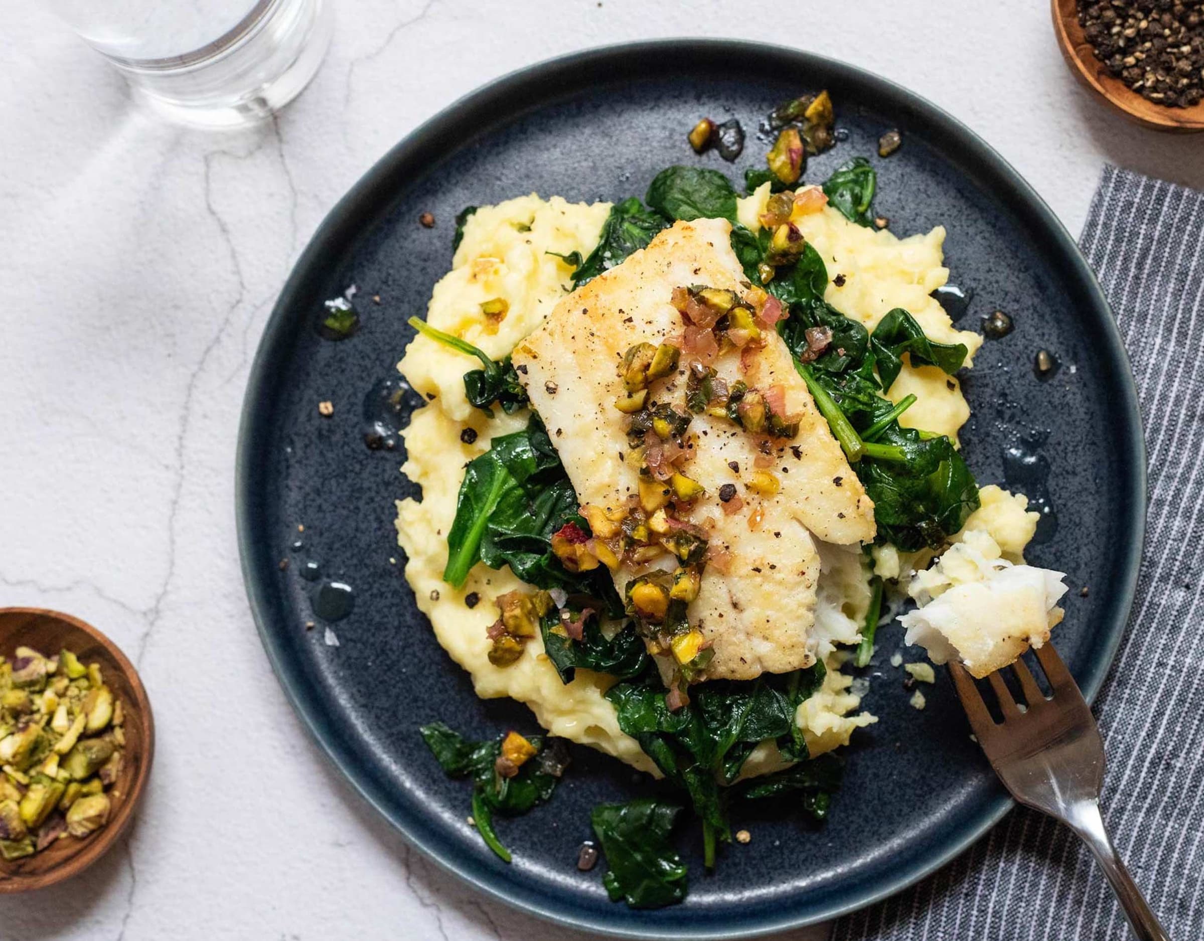 Spoon the potato puree onto plates and top with the spinach. Arrange the fish on the spinach and spoon the sauce over everything. Season with salt and pepper to taste. Enjoy!