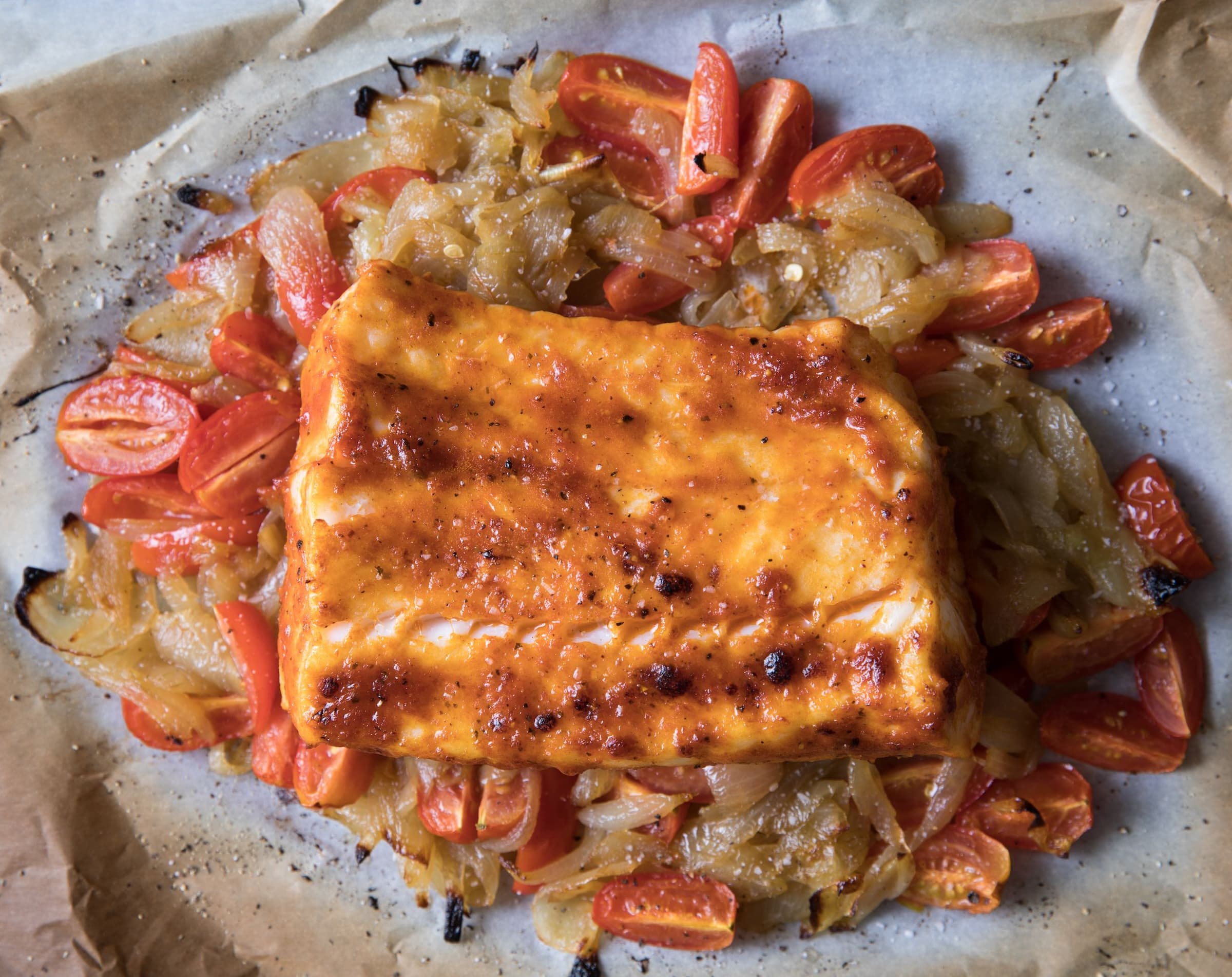 Season lingcod fillet with salt and coat it with a layer of the butter-tomato paste glaze. Fish should not be visible underneath the coating.