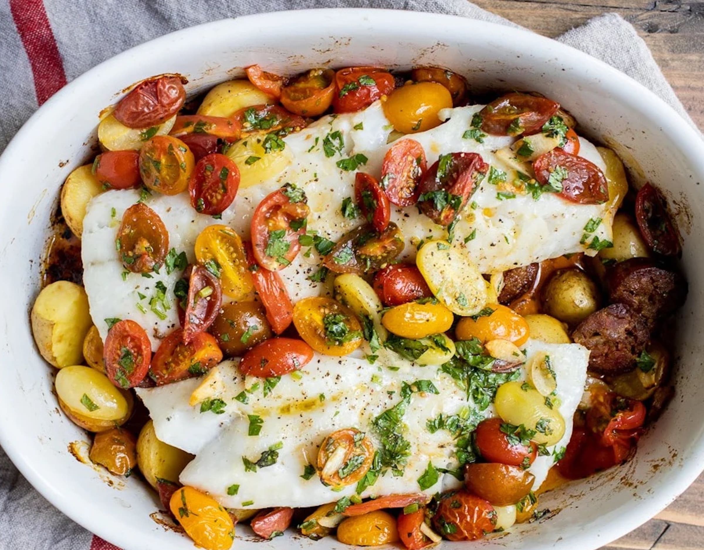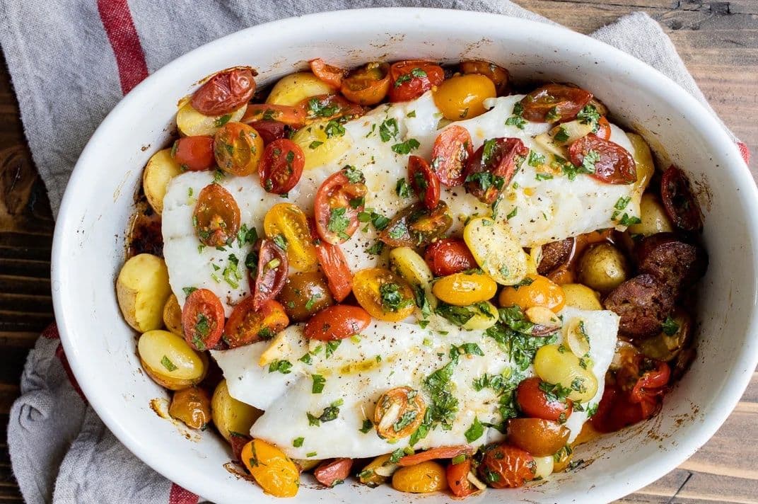 Spicy chorizo sausage becomes a perfect partner for sweet cherry tomatoes and lean Pacific cod.