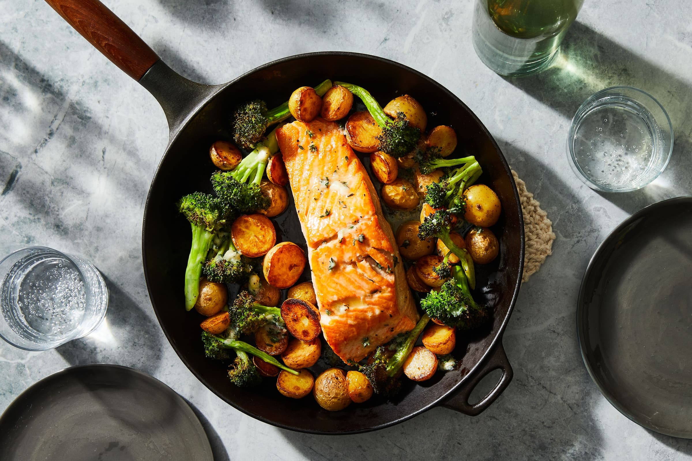 Sheet pan suppers make dinnertime a breeze. Here, the potatoes get a head start in boiling water before being combined with broccoli and salmon on a baking sheet for final roasting. At the end, the veggies are tossed with garlic butter to add richness and flavor.