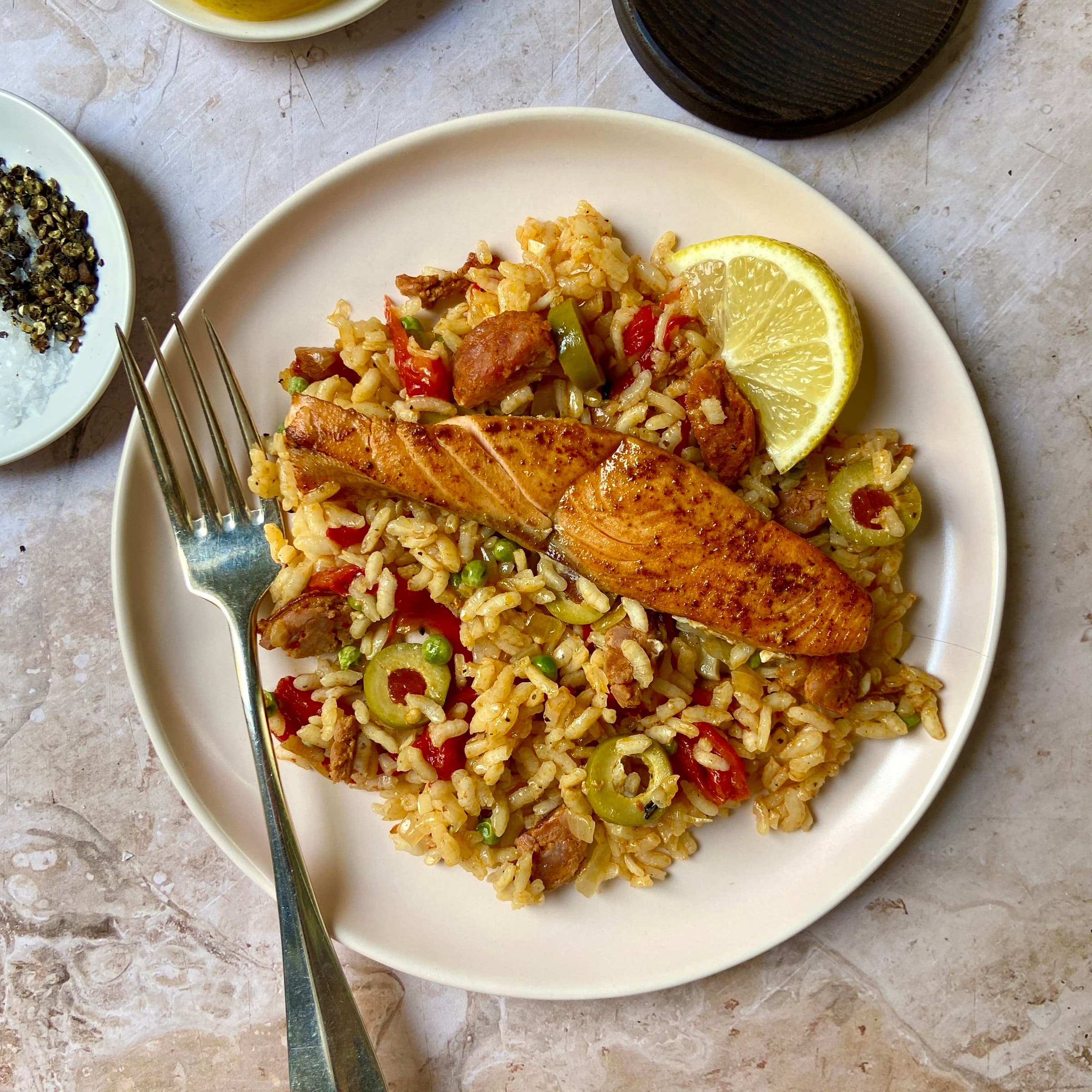 Let sit off the heat for 2 minutes. Serve the salmon and rice with lemon wedges for squeezing over.