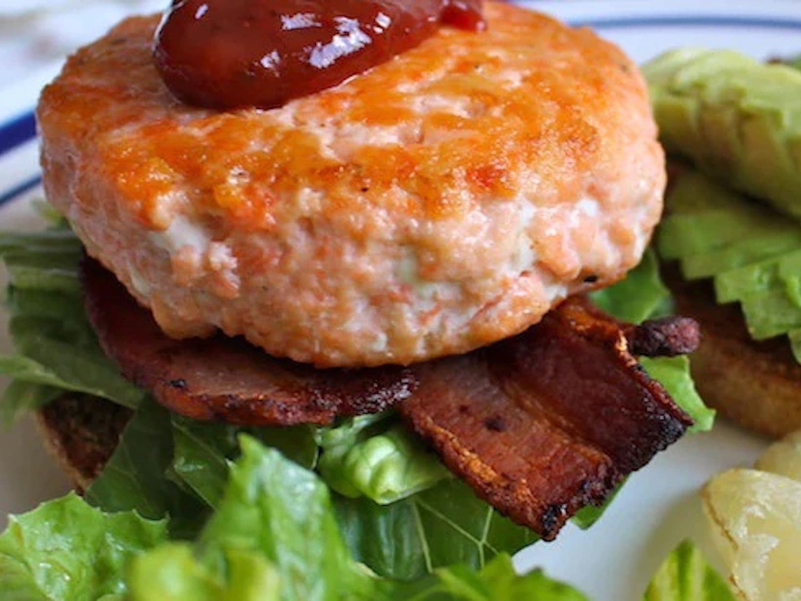 Assemble burgers: place lettuce on english muffin, topped with bacon and a salmon patty. Combine ketchup and chipotle in a small bowl and spread atop the salmon patty. Add sliced avocado and top of english muffin.