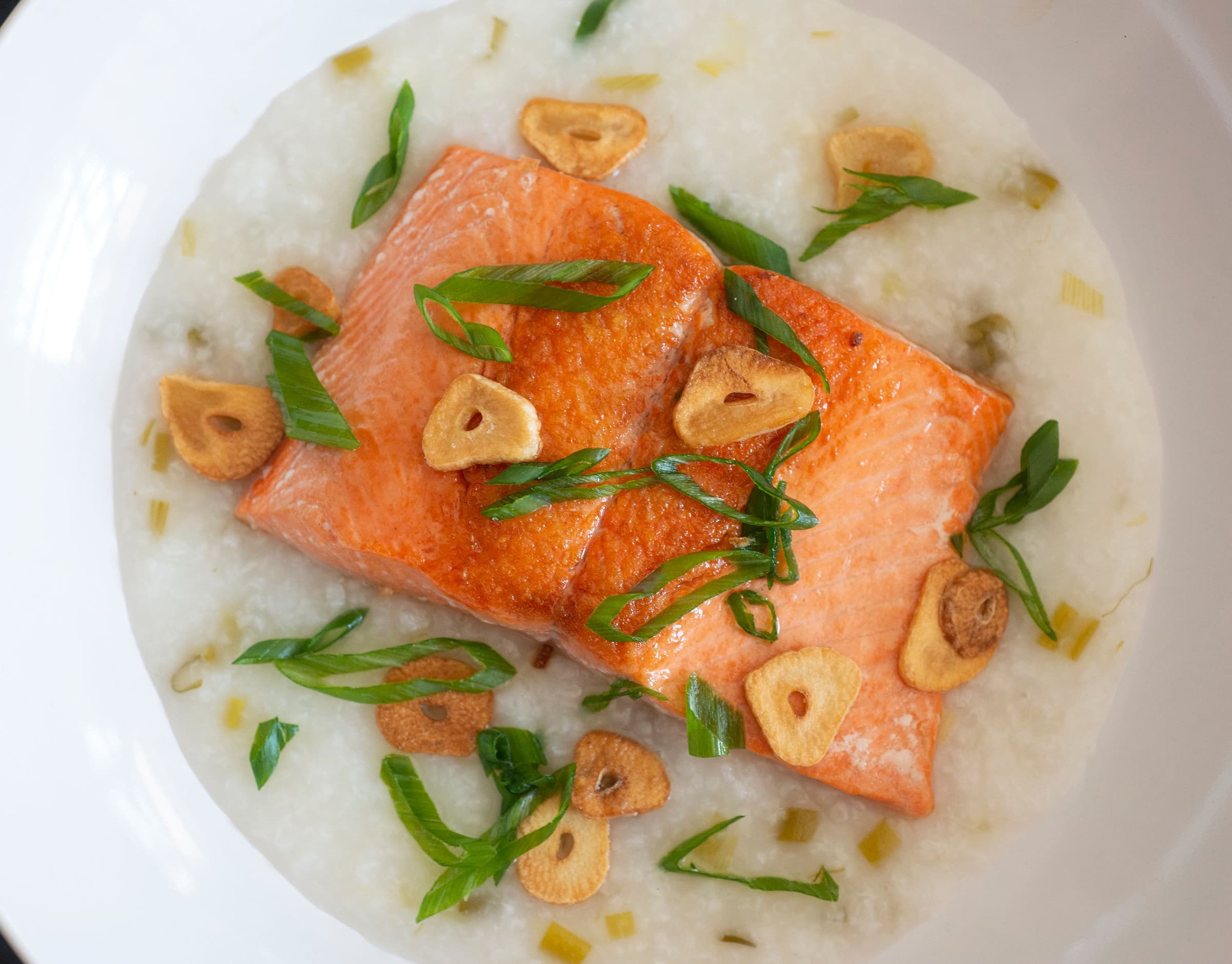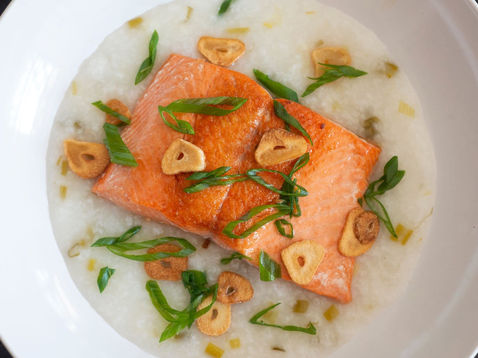 Spoon the congee into shallow bowls and top with the salmon (serve skin-side up for extra crisp skin). Garnish with garlic chips, sliced scallion greens, and Szechuan-style chili oil.