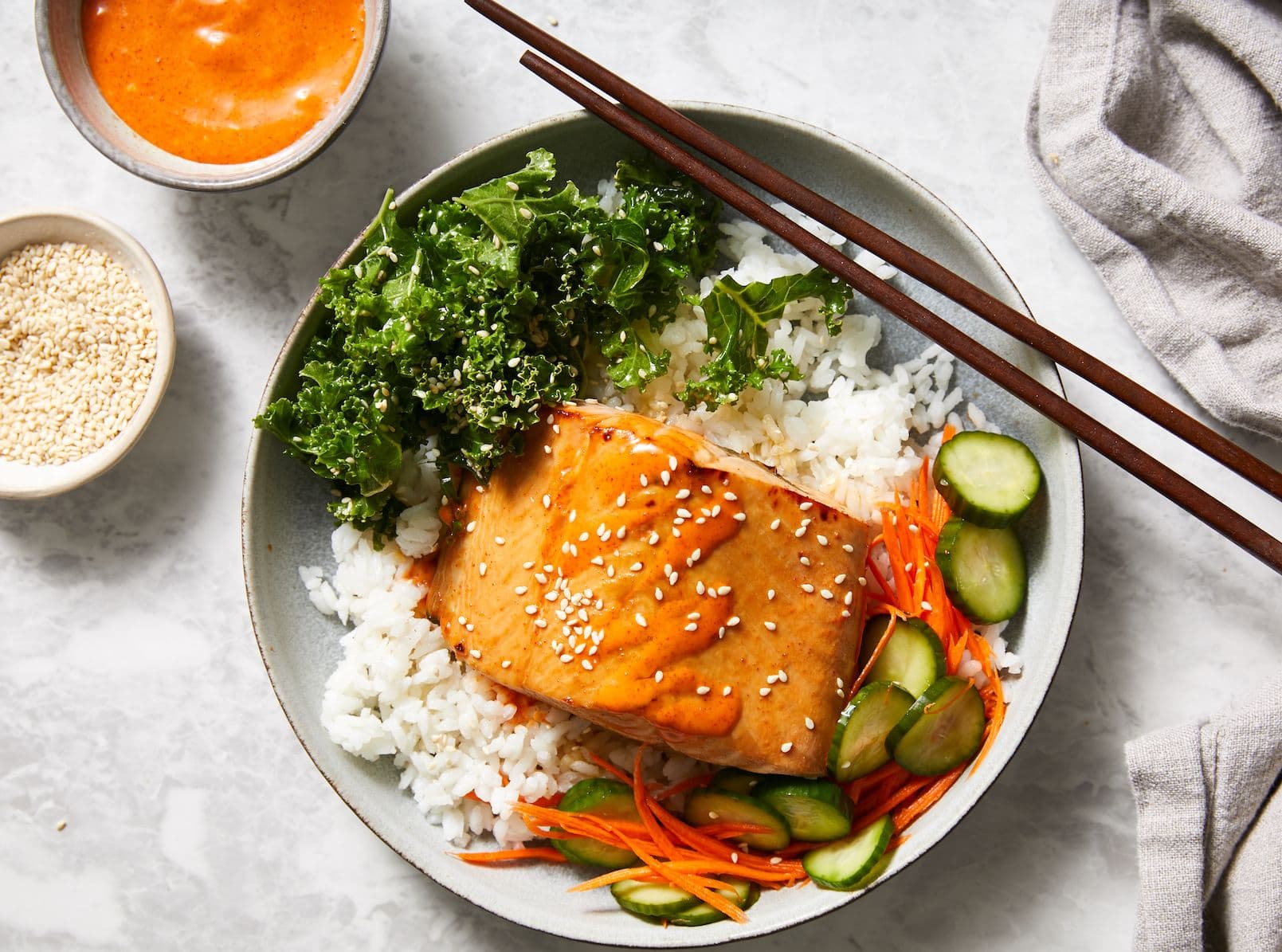 Spoon the rice into bowls and top with salmon, pickled vegetables, and kale salad. Drizzle with some of the pickle dressing and spicy mayo, and garnish with the remaining sesame seeds.