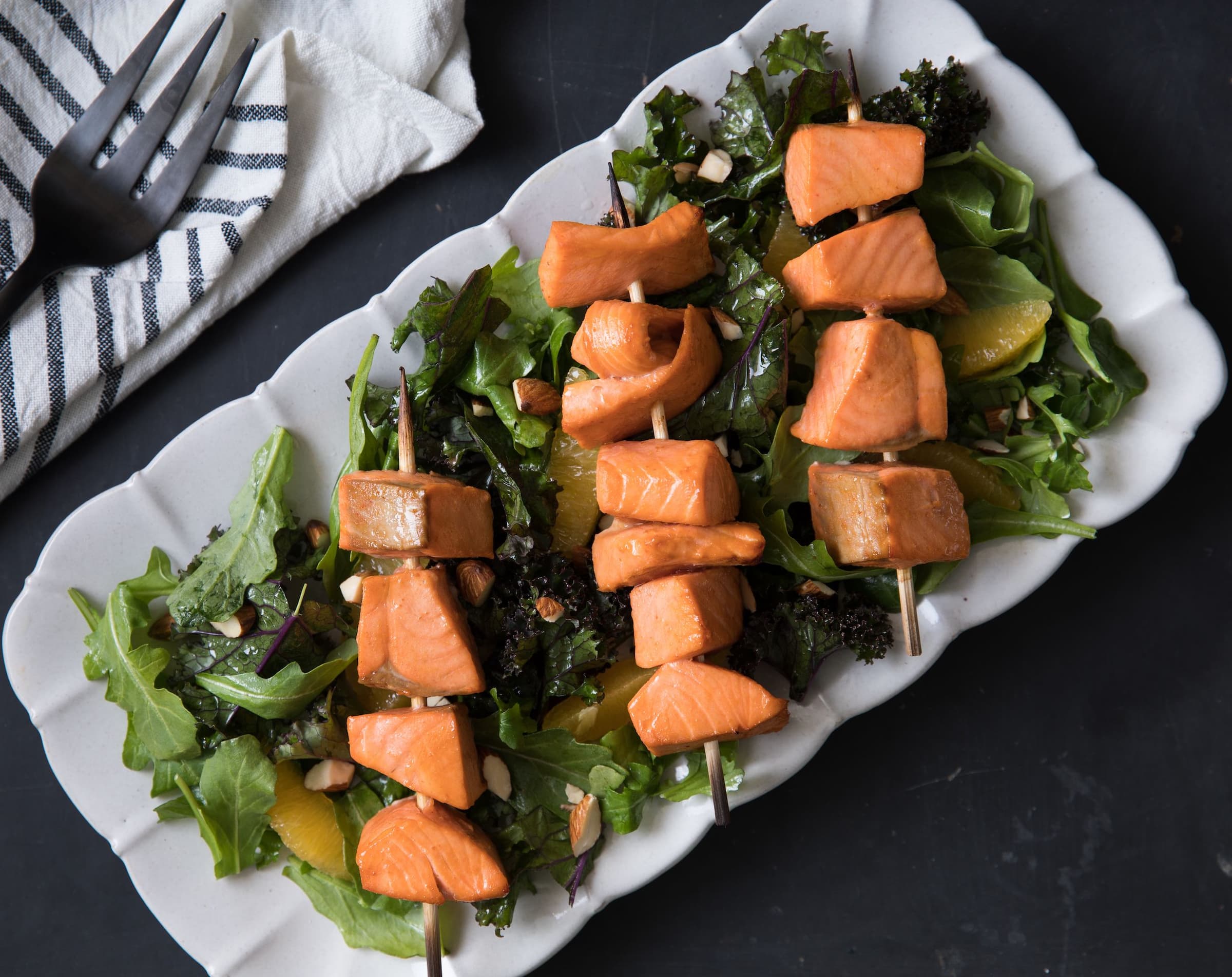 Toss greens with ½ cup pickled onions, chopped almonds, nectarine slices, and maple-mustard vinaigrette. Top with salmon kebabs.
