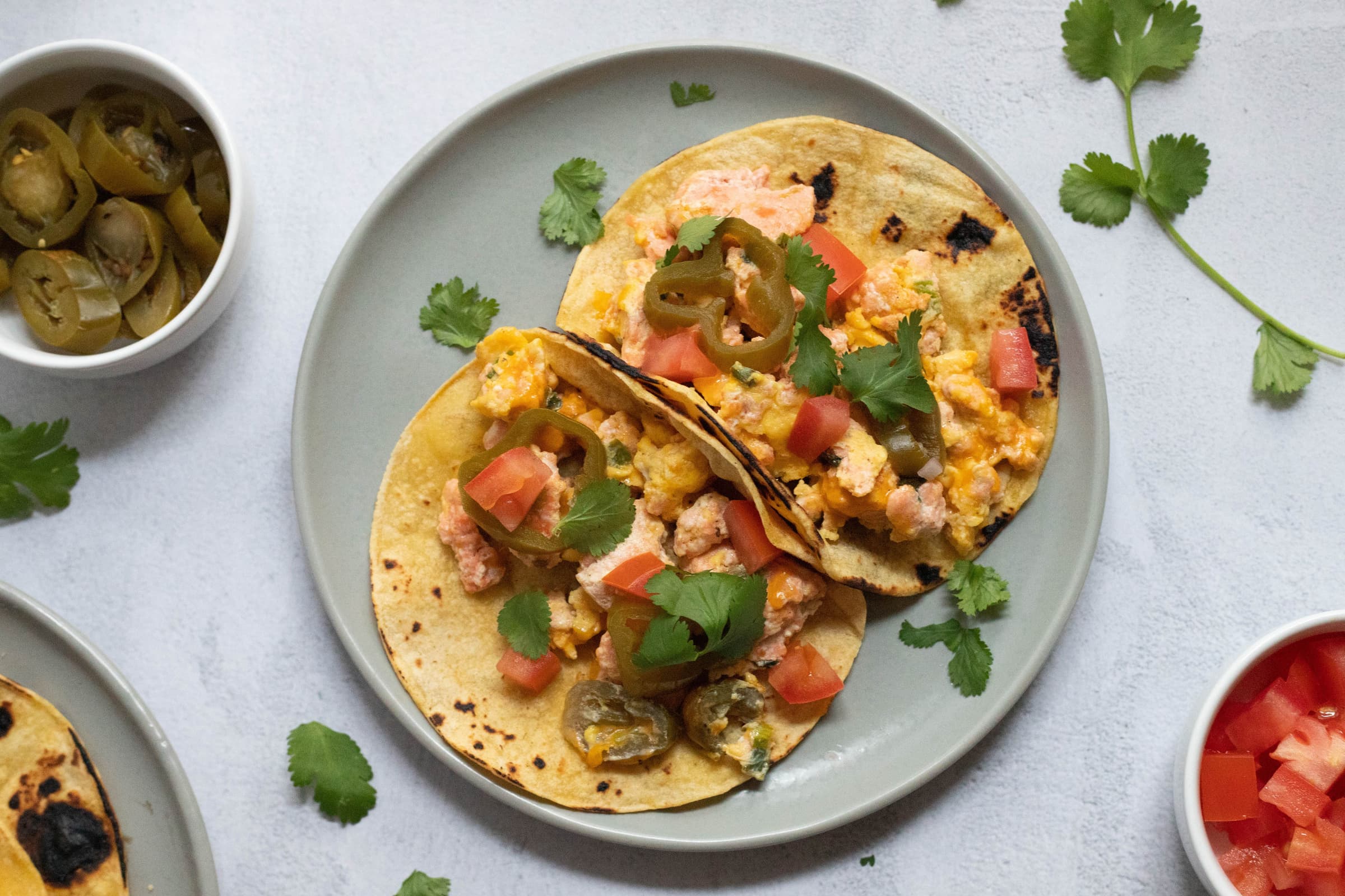 Over a gas flame or under a broiler, toast the tortillas until lightly charred in spots, about 10 seconds per side. Fill each tortilla with the salmon scramble and top with cilantro, chopped tomatoes, the remaining pickled jalapenos, and hot sauce on the side. Enjoy!