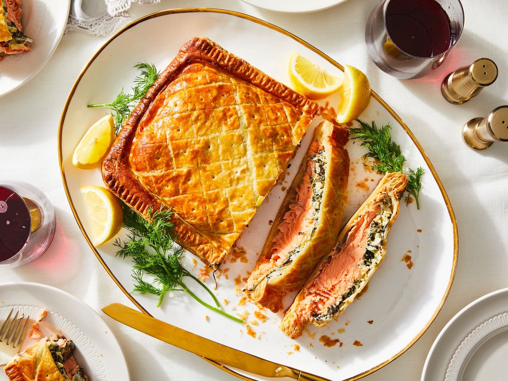 Salmon Wellington, also known as—salmon en croute, coulibiac, or salmon puffs—is a showstopper at the dinner table. Traditionally made with cream cheese, dill, sautéed spinach, and salmon, the fillings are infinitely riffable. Here we’ve added tender sautéed leeks, a bit of grainy mustard, and a pinch of caraway (which is entirely optional).