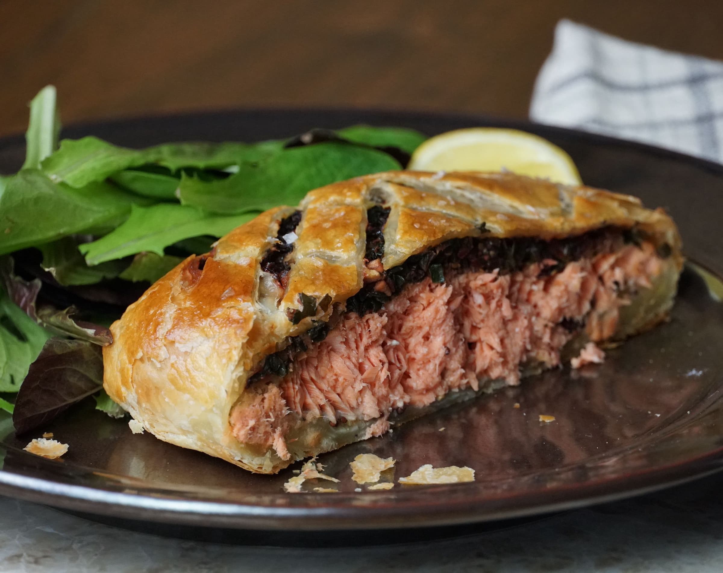 A Wellington never fails to impress, and though there are many steps, it’s worth it! The chard-apple-mustard mixture is easy to prepare and is a perfect complement to the mild, subtle flavor of the star of the show, coho salmon. Encasing all this deliciousness in a crisp, golden puff pastry crust makes this a showstopper.