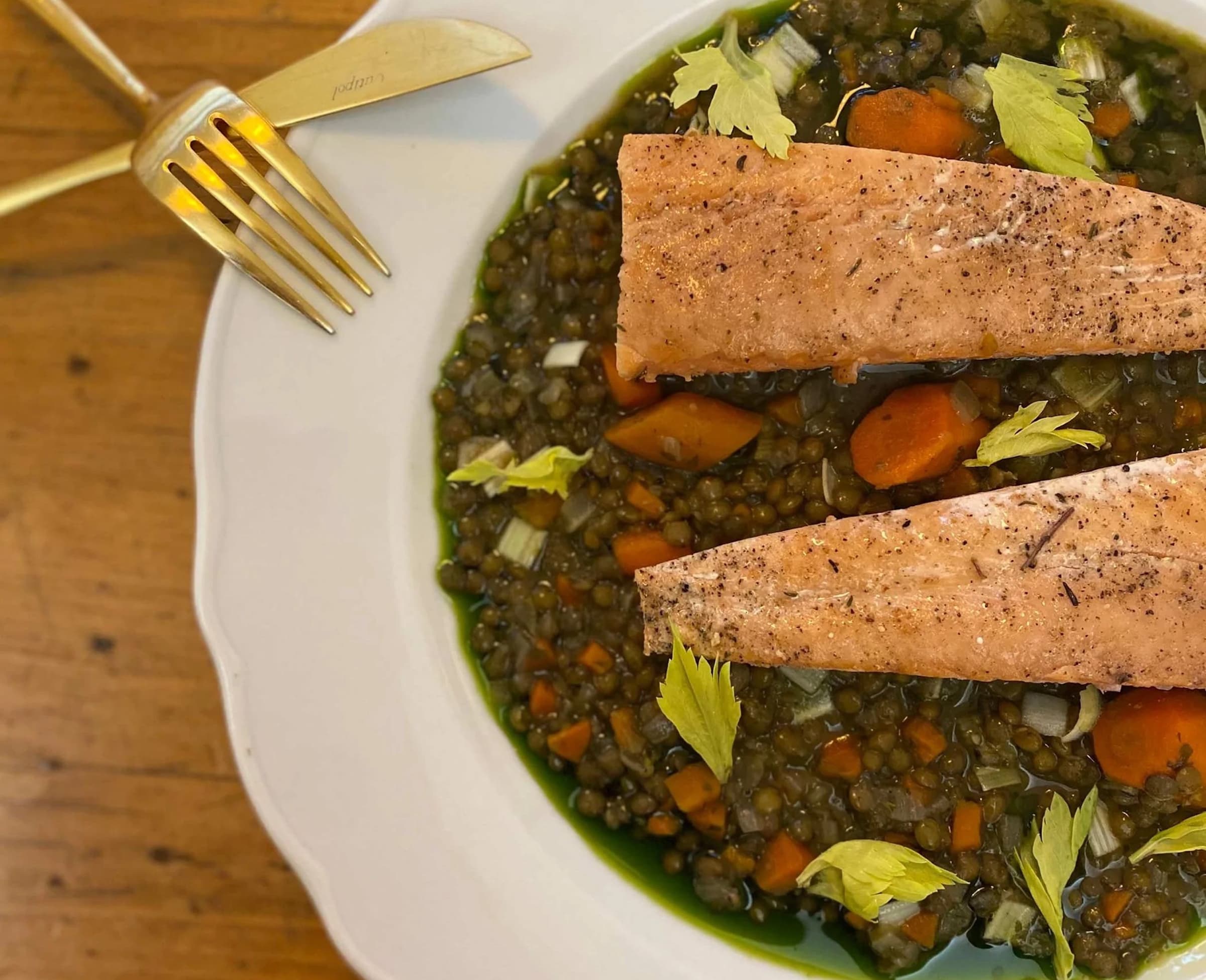 Place lentils on a plate, with salmon on top. Garnish with green oil and celery leaves. Enjoy!