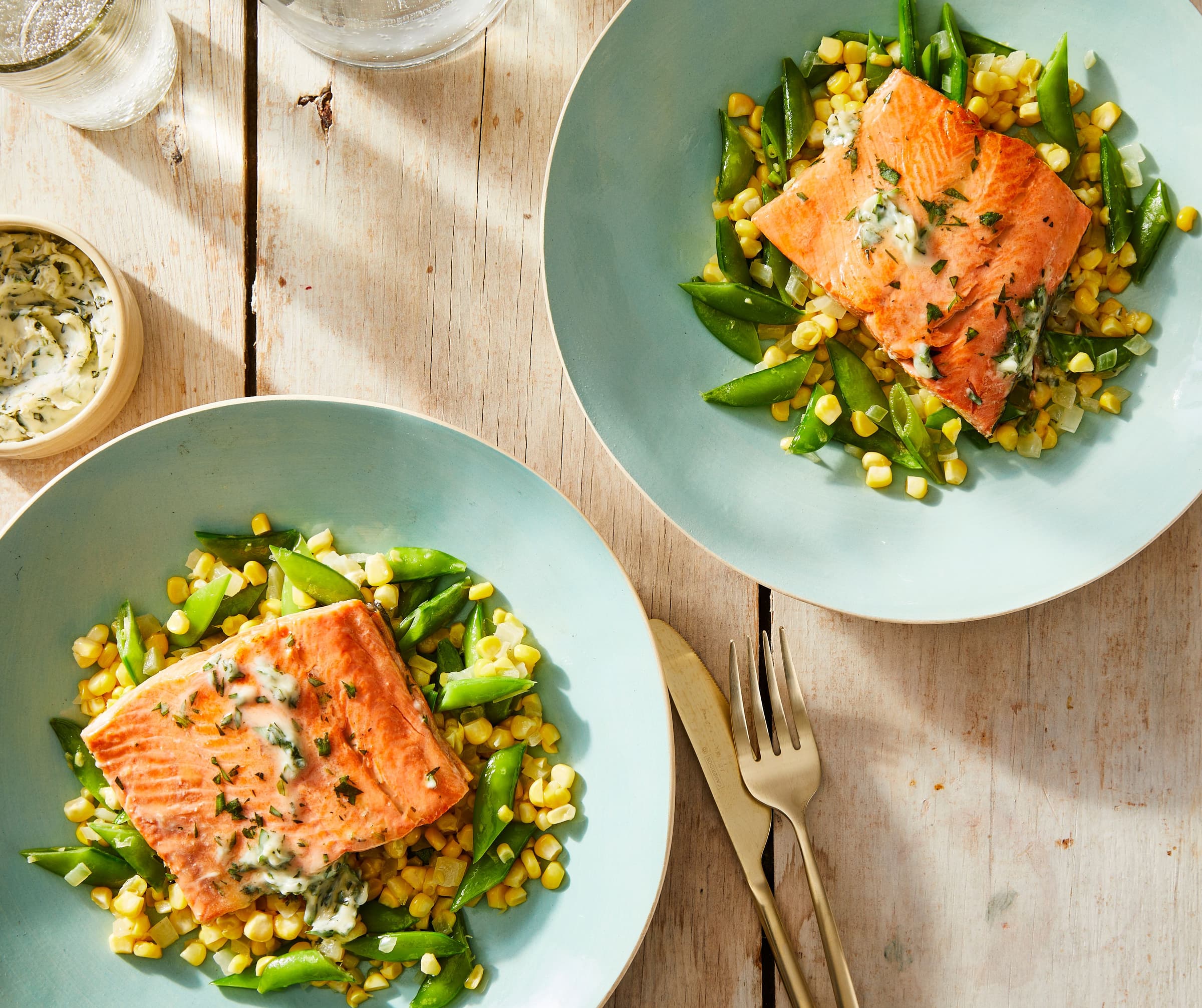Nothing says summer like succotash made with fresh corn served alongside crispy-skinned salmon. This simplified version of the classic side dish adds sugar snap peas, but feel free to use whatever green vegetable you like.