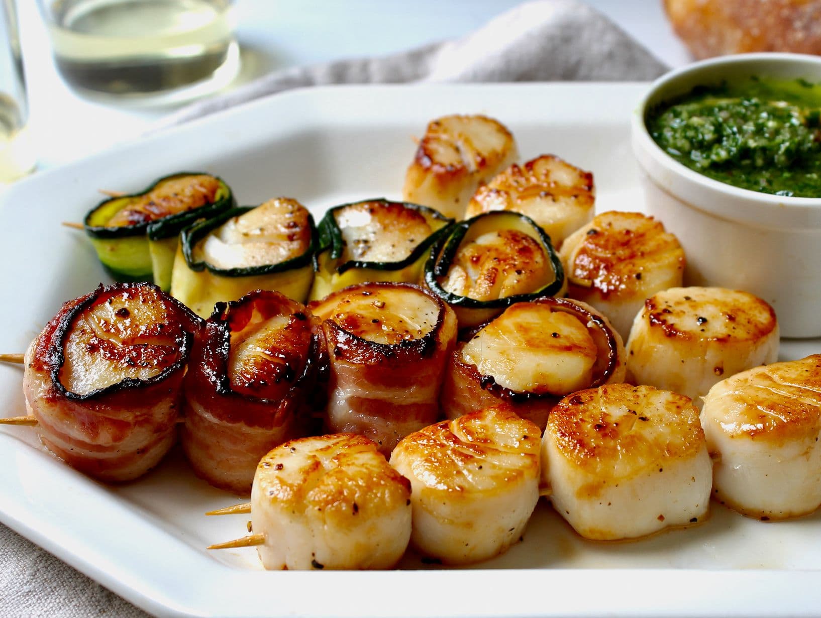 A simple herb sauce is all you need to dress these luscious, sweet scallops. However, wrapping them in ribbons of zucchini or par-cooked bacon adds flavor and flair. Using double skewers for the kebabs means there’s no need to individually turn each scallop, reducing the possibility of overcooking them.