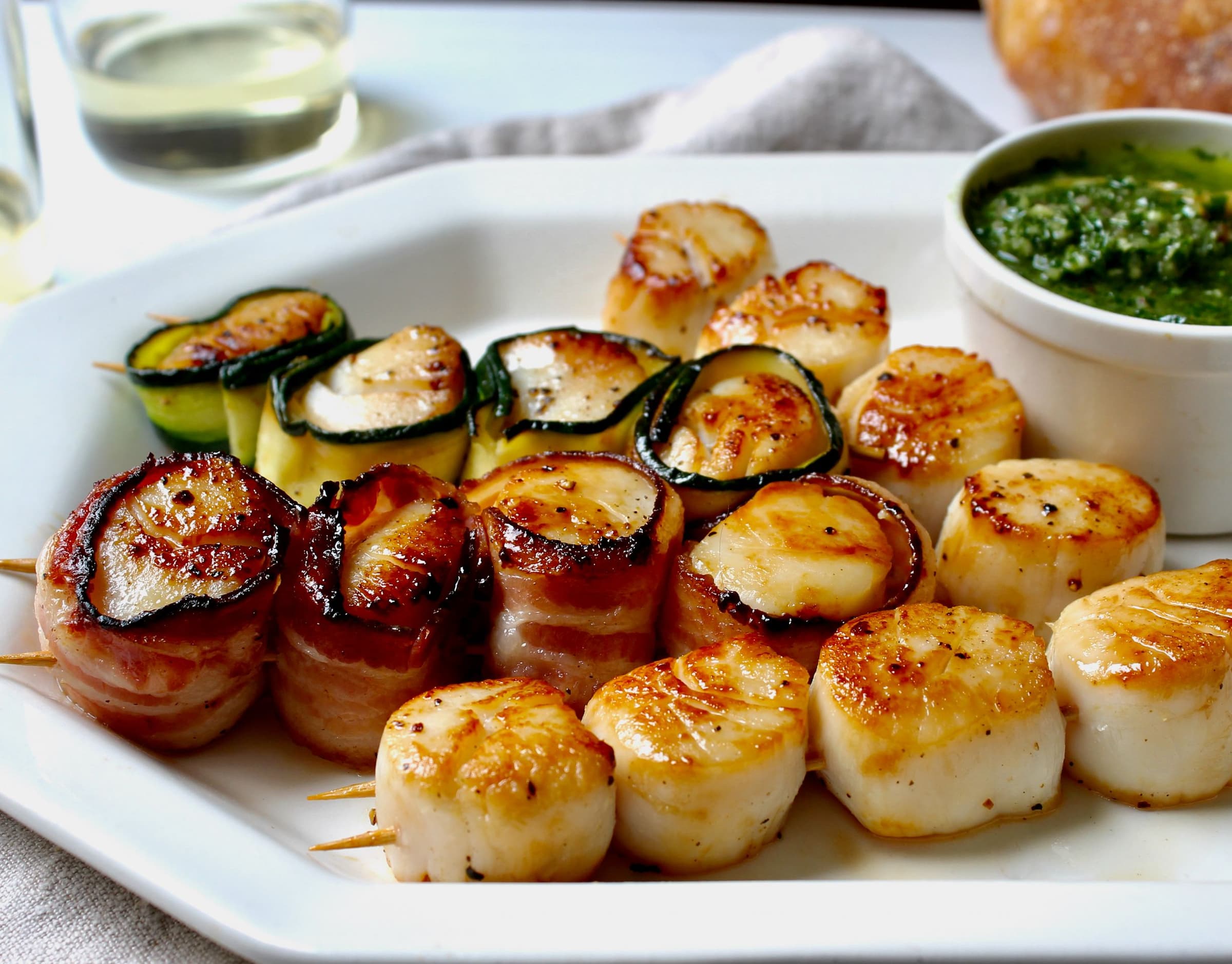 Wrap each scallop in a ribbon of zucchini or a pre-cooked piece of bacon before skewering for smoky richness.