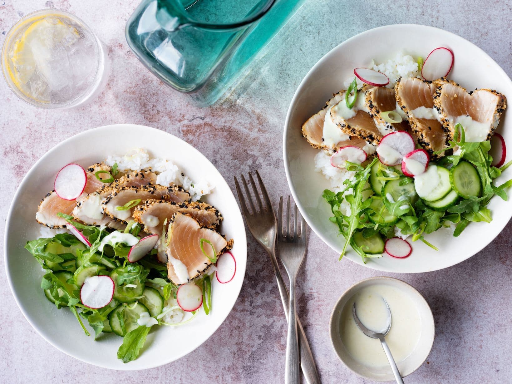 Add the arugula to the cucumbers. Spoon the rice into bowls and top with the sliced tuna and the cucumber-arugula salad. Drizzle with the wasabi dressing and garnish with scallions and radishes.