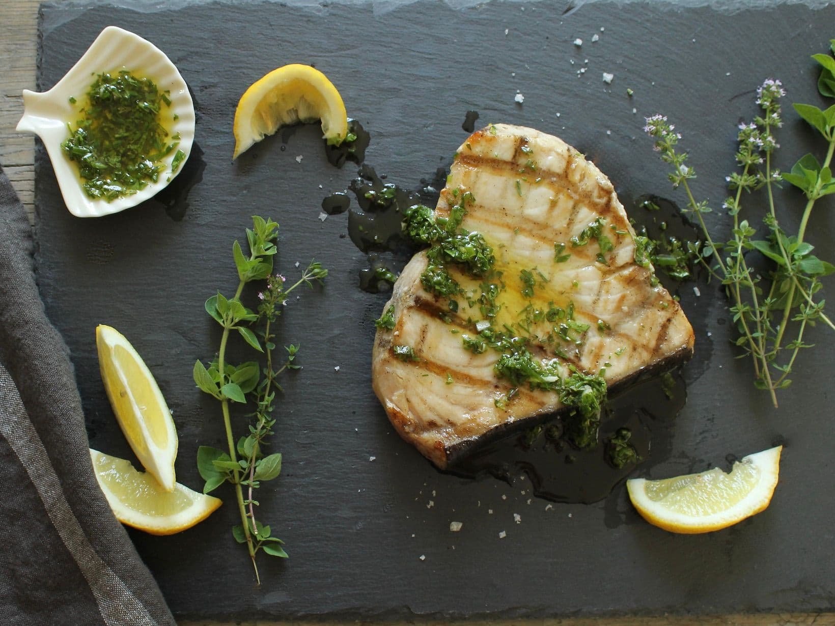 Rich and meaty swordfish steaks are perfect for this classic preparation. The fish is grilled then immediately marinated in a lemony garlic and herb dressing. The heat allows the marinade to penetrate just enough to infuse flavor and balance the richness of the fish. For pan-searing, see Pro Tips below.