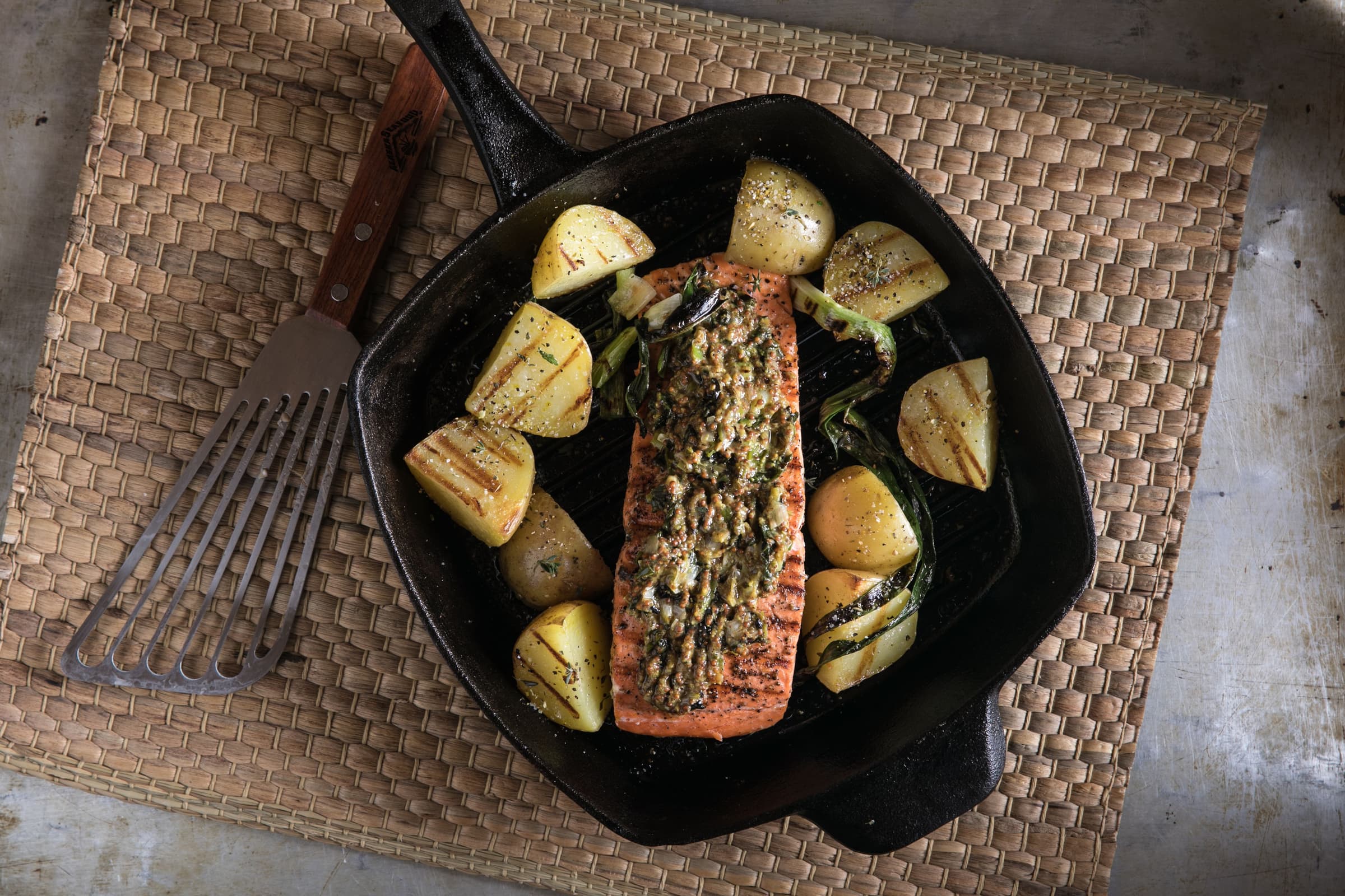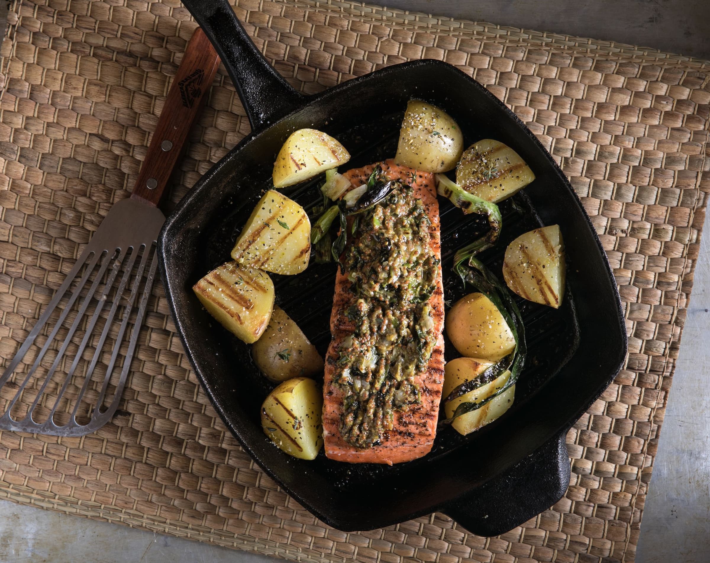 Generously cover the flesh-side of the salmon with the mustard rub. Place skin-side down on the grill (no need to flip!) and cook 20-24 minutes.