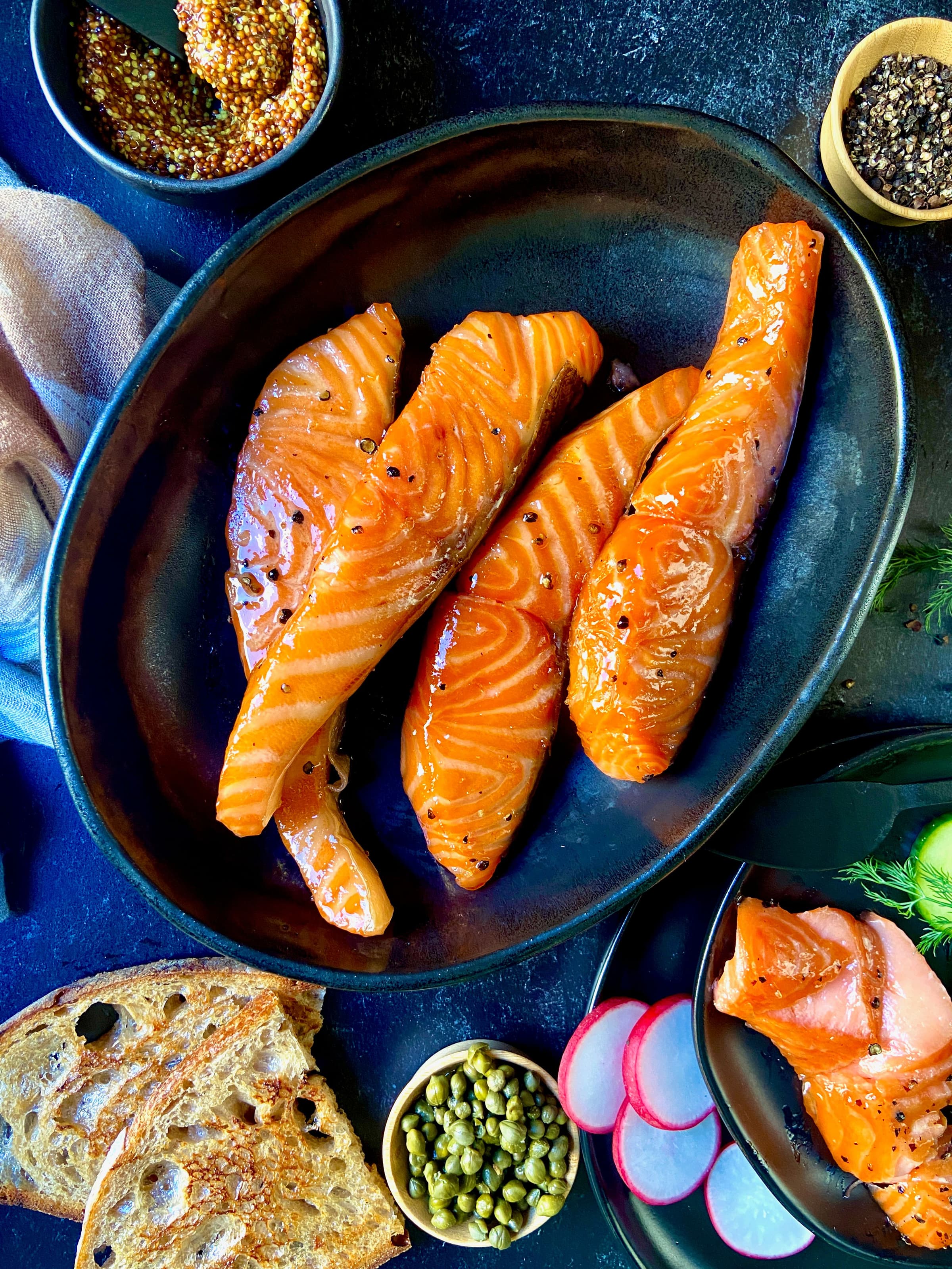 Preheat the oven to 180°F. Cook the salmon until caramelized and firm, about 1 hour, brushing once or twice with maple syrup while cooking. Let cool completely, then serve.