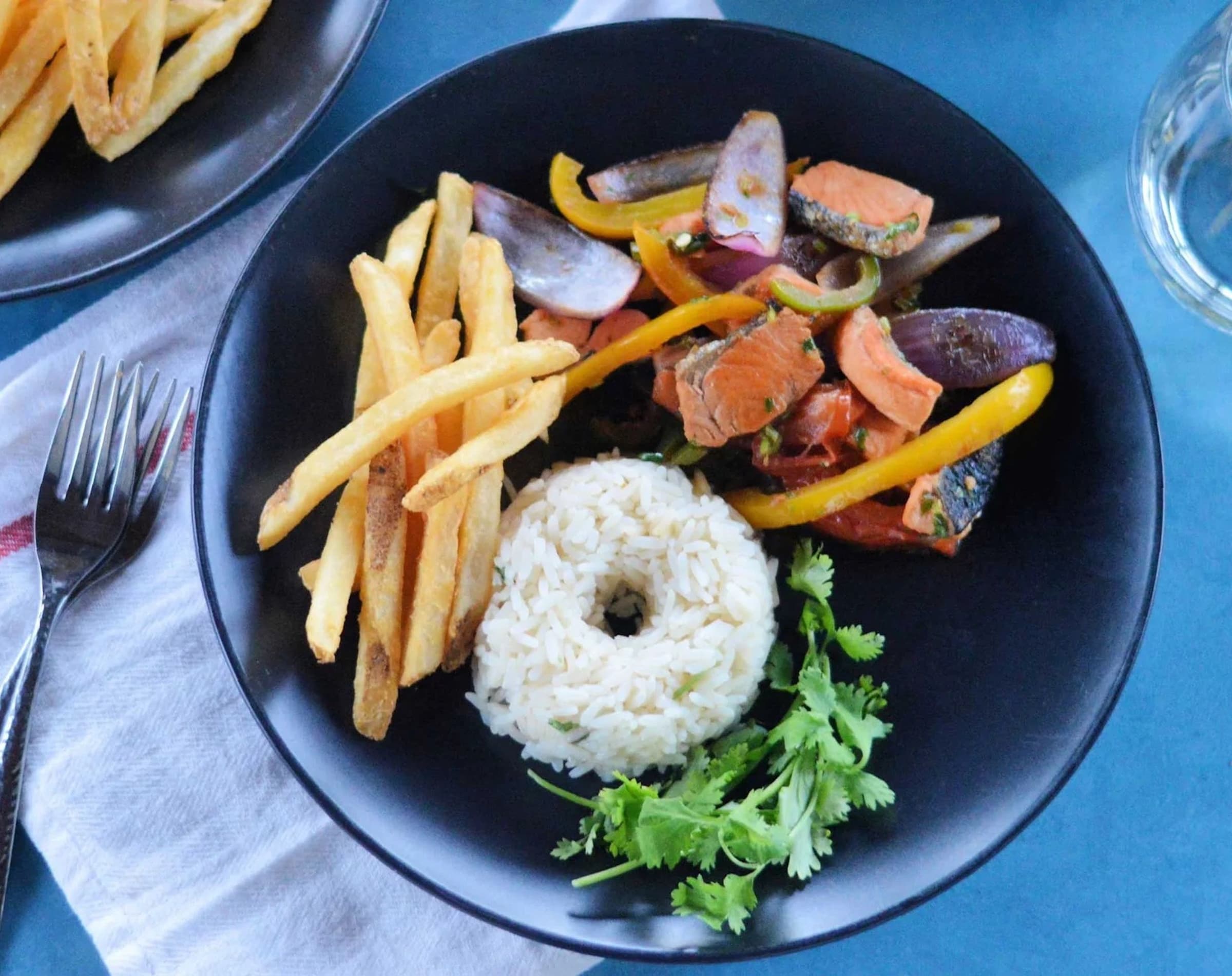 Saltado is the Spanish word for stir fry. The literal translation is “jumped.” I am presenting a spin on the traditional Peruvian Lomo Saltado, using salmon instead of beef. While aji amarillo is one of the staple ingredients in Peruvian cuisine, it is hard to come by. This recipe uses yellow bell pepper to keep the same visual effect and jalapeño for the additional heat. You will find that this dish makes for an easy weeknight dinner full of flavor.