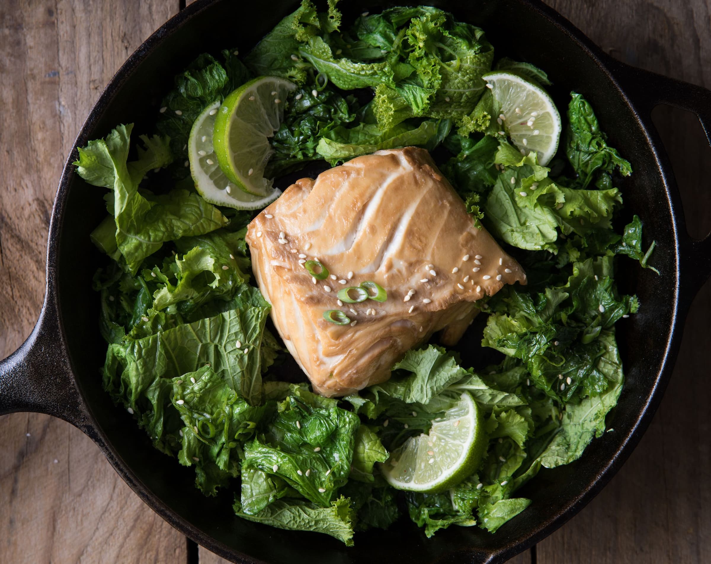 Transfer the fish and greens to a serving platter, leaving the soy brine behind. Add the lime juice to the skillet with the brine, swirling to combine.