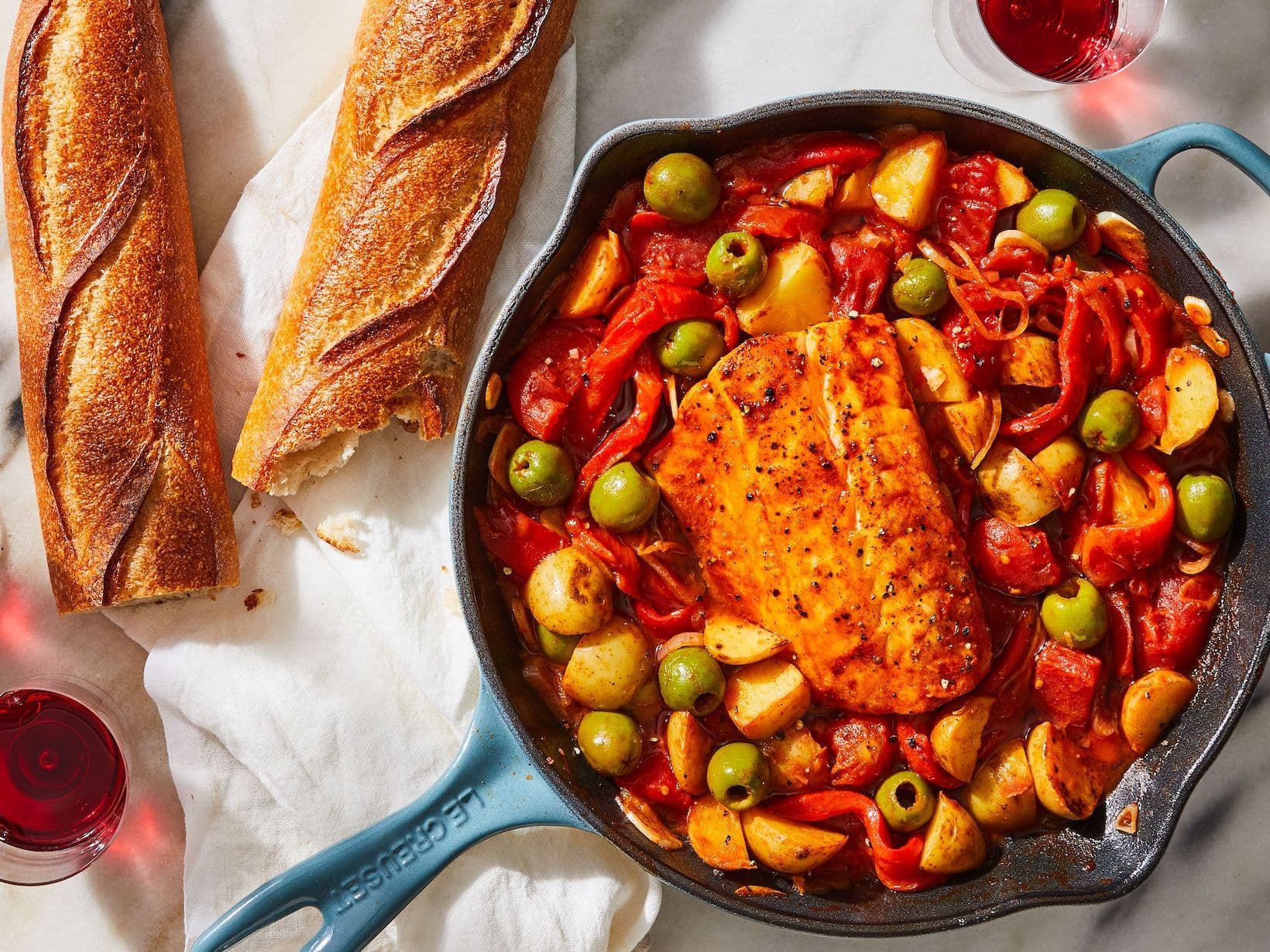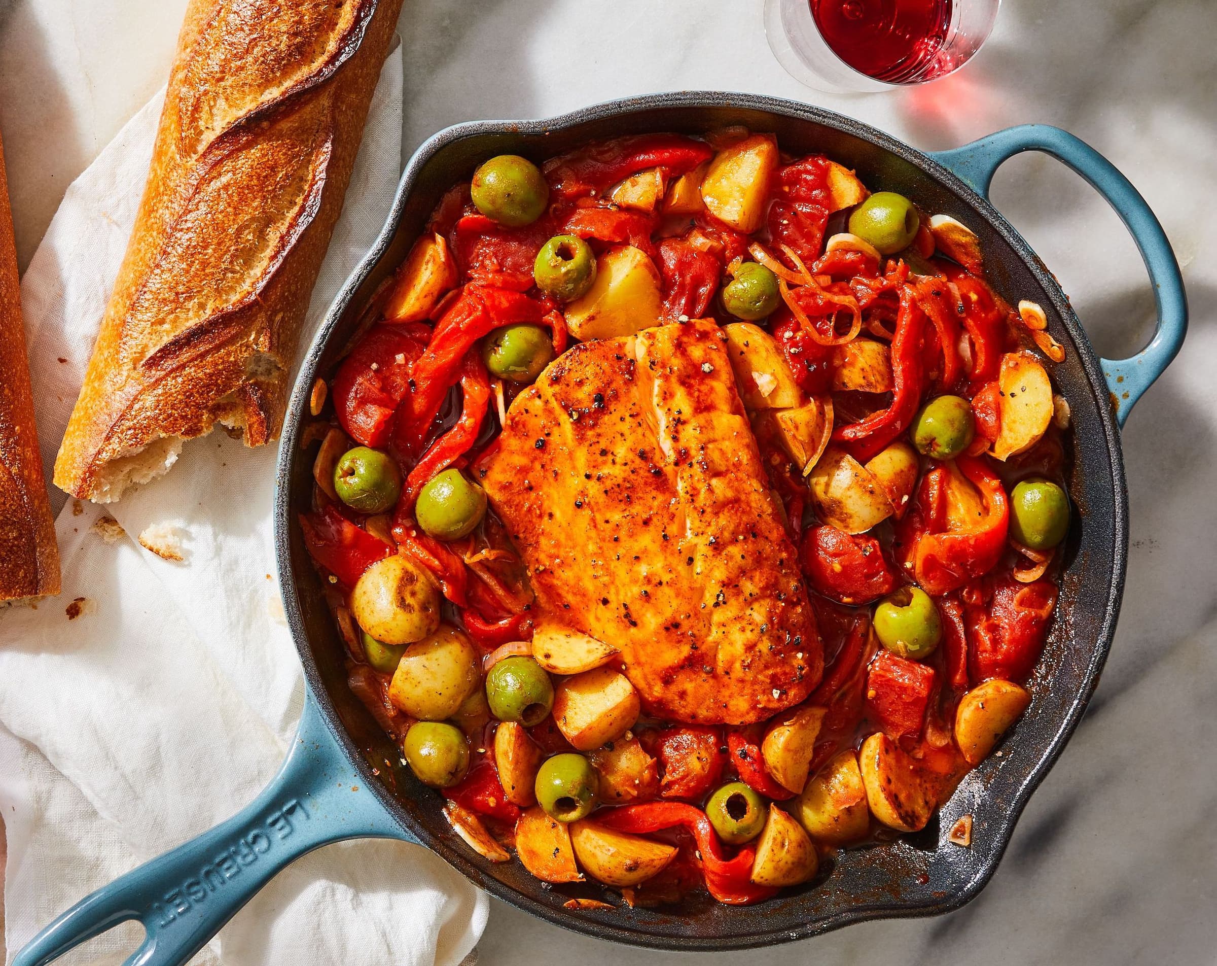 This Spanish dish, called ajoarriero, typically uses salt cod (bacalao), which needs to be soaked overnight to soften and remove the salt. We’re using lingcod along with the classic tomato, olives, roasted peppers, and potatoes, but any firm white fish like rockfish, cod, or halibut will do.